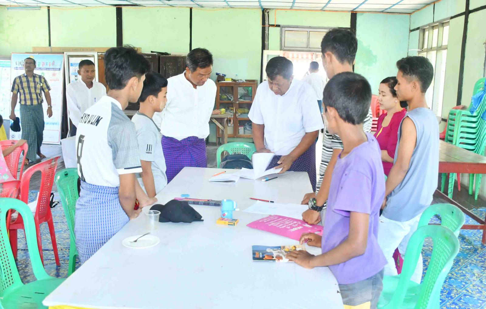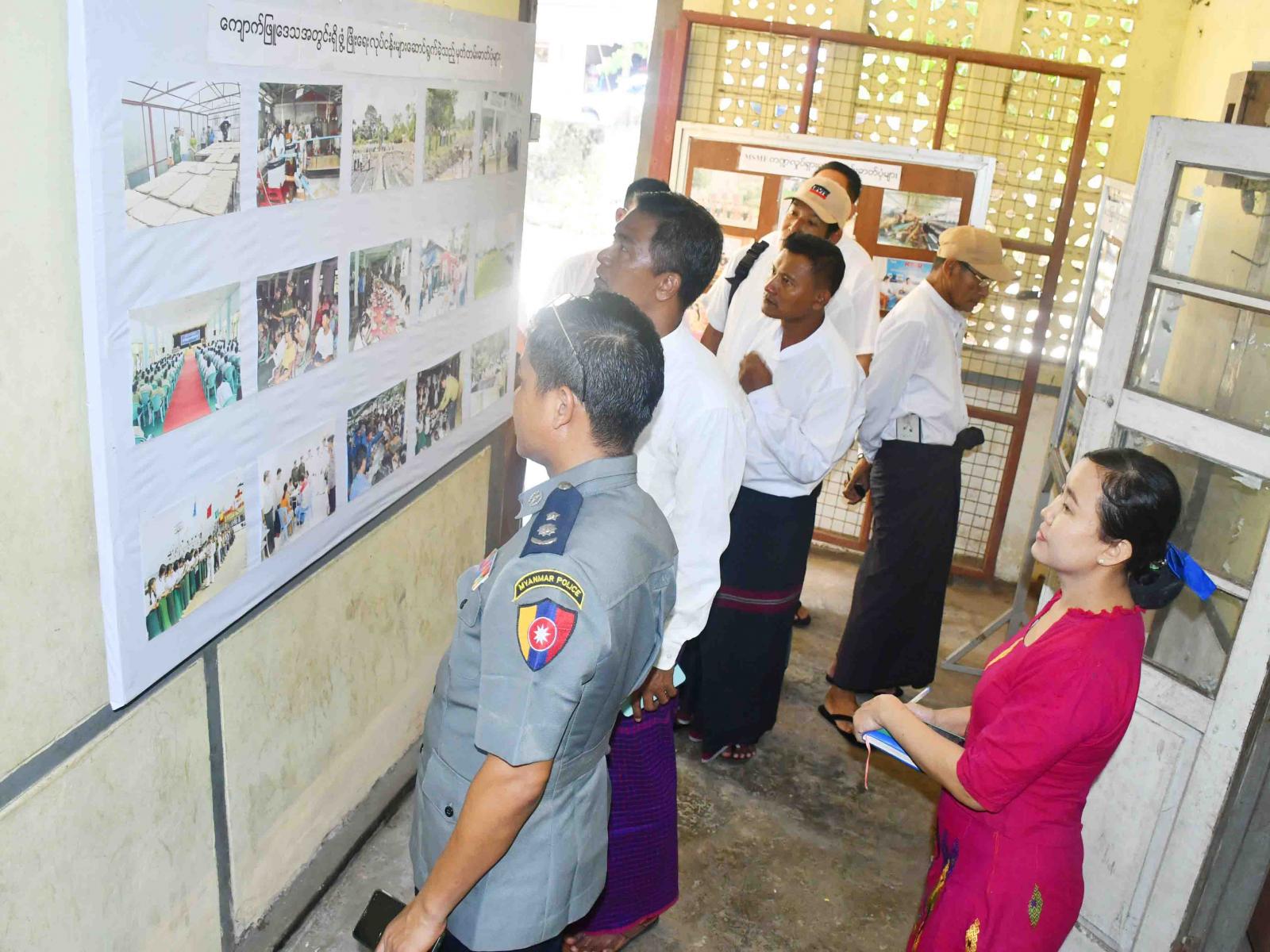 ထိုသို့လှည့်လည်ကြည့်ရှုရာတွင် ခရိုင်စီမံအုပ်ချုပ်ရေးအဖွဲ့ဥက္ကဋ္ဌ ဦးနေမင်းသူနှင့် အဖွဲ့ဝင်များ၊ မြို့နယ်စီမံအုပ်ချုပ်ရေးအဖွဲ့ဥက္ကဋ္ဌ ဦးမျိုးမင်းထွဏ်းနှင့်အဖွဲ့ဝင်များ၊ ဌာနဆိုင်ရာတာဝန်ရှိသူများက ပြန်ကြားရေးနှင့်ပြည်သူ့ဆက်ဆံရေးဦးစီးဌာန၊ လူထုအခြေပြုဗဟိုဌာန Community Centre ခန်းမသို့ သွားရောက်ပြီး အဆိုပါခန်းမ၌ အခြေခံအင်္ဂလိပ်စာသင်တန်းနှင့် ပန်းချီသင်တန်းပြသနေမှုတို့အား ကြည့်ရှုအားပေးပြီး သင်တန်းနည်းပြဆရာများနှင့် သင်တန်းသား၊ သင်တန်းသူများကို ရင်းရင်းနှီးနှီးတွေ့ဆုံကာ လိုအပ်သည်များကို ပေါင်းစပ်ညှိနှိုင်းဆောင်ရွက်ပေးသည်။ ထို့နောက် ခရိုင်စီမံအုပ်ချုပ်ရေးအဖွဲ့ဥက္ကဋ္ဌနှင့် အဖွဲ့ဝင်များ တာဝန်ရှိသူများသည် ပြန်ကြားရေးနှင့်ပြည်သူ့ဆက်ဆံရေးဦးစီးဌာန၌ ပြသထားသည့် အသိပညာပေးနံရံကပ်စာစောင်များ၊ ဒေသဖွံ့ဖြိုးရေးလှုပ်ရှားမှုဓာတ်ပုံများအား စိတ်ပါဝင်စားစွာဖြင့် ကြည့်ရှုအားပေးခဲ့ကြသည်။
