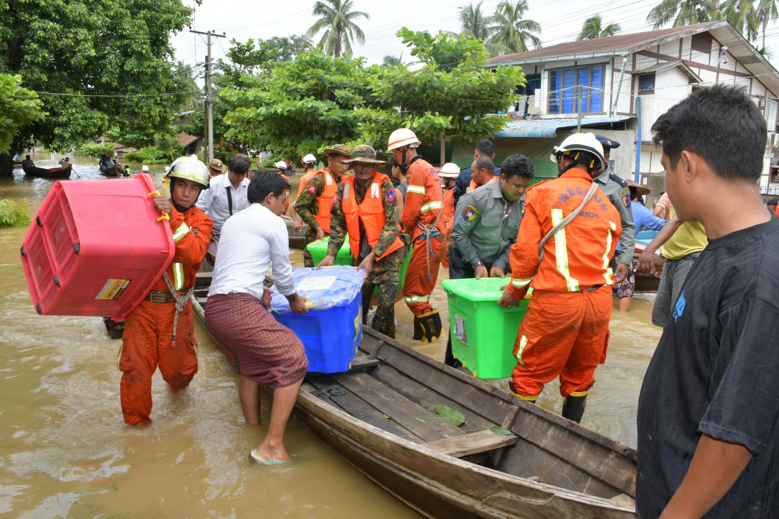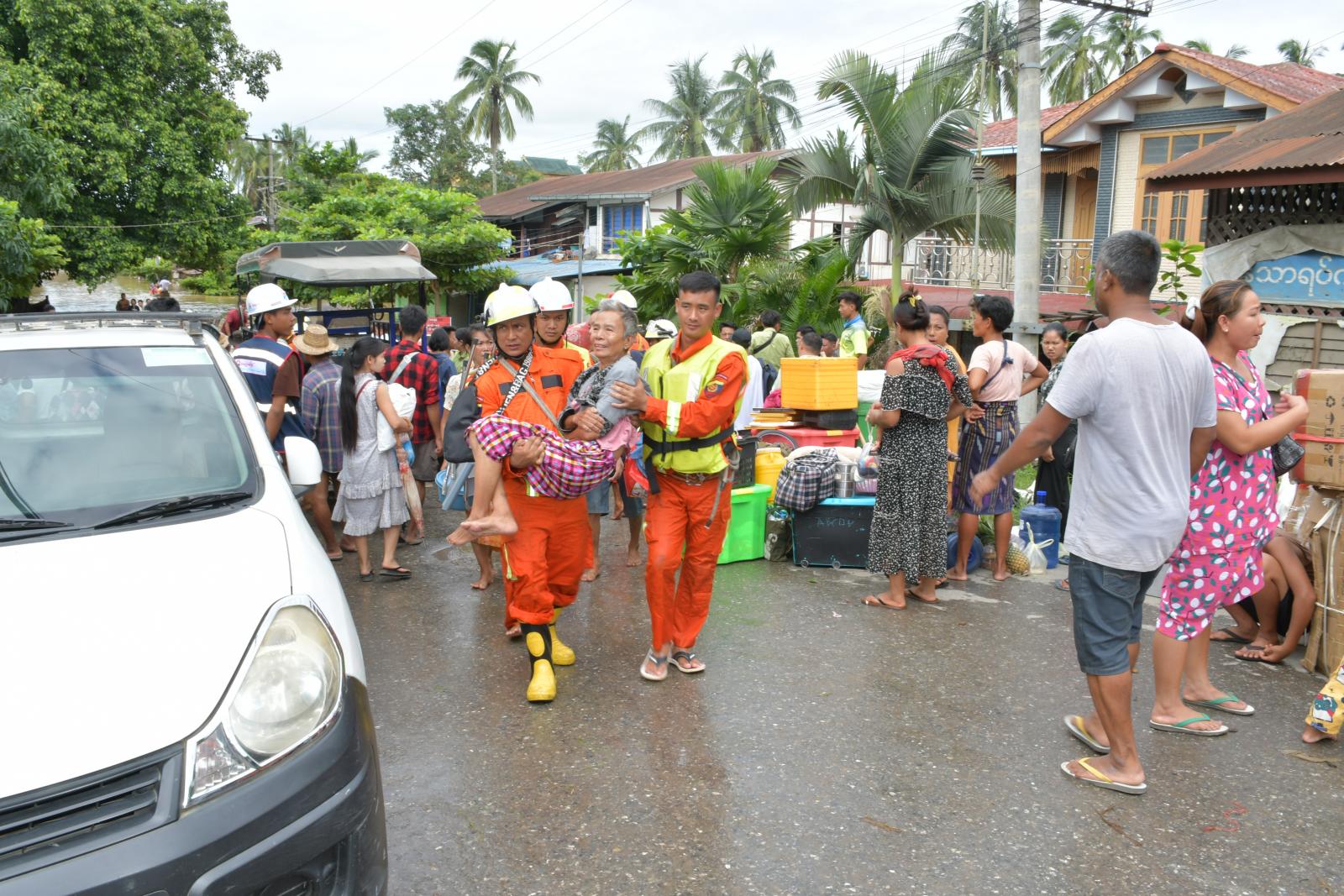 ဆက်လက်၍ ဧရာဝတီမြစ်ရေသည် စိုးရိမ်ရေအမှတ်အထက်သို့ ကျော်လွန်မြင့်တက်လာသဖြင့် မြေနိမ့်ပိုင်းတွင်နေထိုင်ကြသည့် ရေဘေးသင့်ပြည်သူများအား ခရိုင်သဘာဝဘေးအန္တရာယ်စီမံခန့်ခွဲမှုကော်မတီအဖွဲ့ဥက္ကဋ္ဌဦးအောင်ဇော်လတ်နှင့်အဖွဲ့ဝင်များ၊ မြို့နယ်သဘာဝဘေးအန္တရာယ်စီမံခန့်ခွဲမှုကော်မတီအဖွဲ့ဥက္ကဋ္ဌ ဦးအောင်ထွန်းတိုးနှင့်အဖွဲ့ဝင်များ၊ မြို့နယ်အဆင့်ဌာနဆိုင်ရာများ၊ မြို့နယ်မီးသတ်တပ်ဖွဲ့ဝင်များ၊ ရဲတပ်ဖွဲ့ဝင်များ၊ ပရဟိတကူညီရေးအသင်းများနှင့် တပ်မတော်သားများက အ.လ.က(၁)၊ အမှတ်(၄)မူလွန်ကျောင်း၊ အမှတ်(၃)မူလွန်ကျောင်းနှင့် ဓမ္မိကာရုံကျောင်းများတွင် ဖွင့်လှစ်ထားရှိသည့် ရေဘေးကယ်ဆယ်ရေးစခန်းများသို့ ဆက်လက်ရွှေ့ပြောင်းပေးခြင်းနှင့် ထမင်းထုပ်များထောက်ပံ့ပေးဝေခဲ့ကြောင်း သိရှိရသည်။