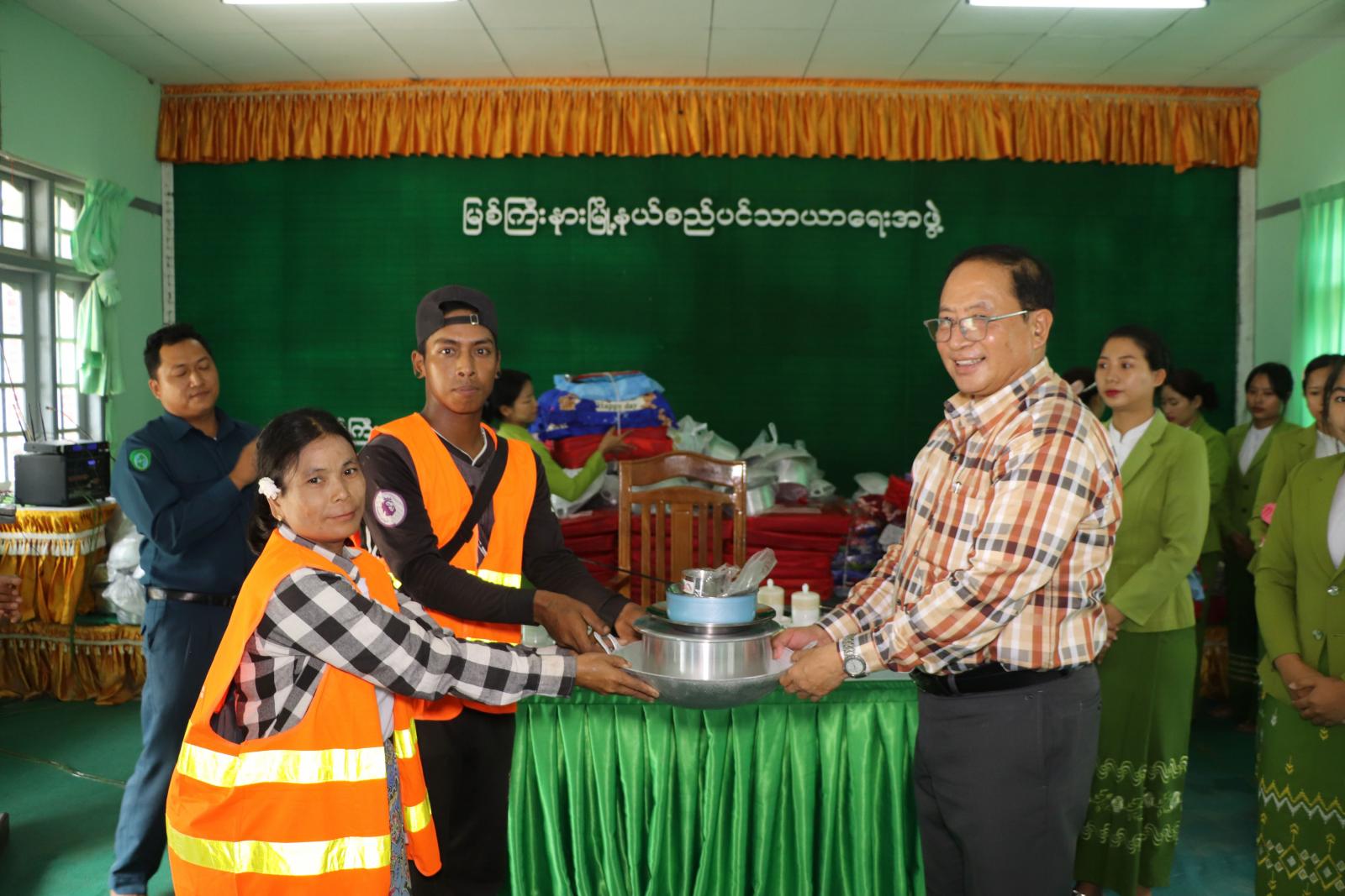 ထို့နောက် ပြည်နယ်ဝန်ကြီးနှင့် တာဝန်ရှိသူများက ရေဘေးသင့်ခဲ့သည် အမြဲတမ်းနှင့် နေ့စားဝန်ထမ်းအိမ်ထောင်စု (၁၀၉) စုတို့အတွက် တန်ဖိုးငွေကျပ် (၁၆၃၅၀၀၀၀) ရှိ စောင်၊ ခြင်ထောင်၊ ခေါင်အုံး၊ အိပ်ရာခင်း၊ ပုဆိုး၊ လုံချည် စသည့်အဝတ်အထည်များနှင့် မီးဖိုချောင်သုံးပစ္စည်းများကို အသီးသီးထောက်ပံ့ပေးအပ်ခဲ့ကြောင်း သိရသည်။