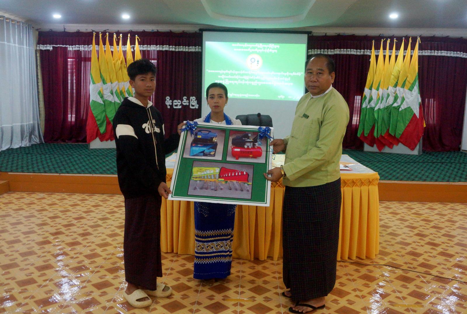 ထို့နောက် ယင်းသင်တန်းဆင်းပွဲ၌ ဆိုင်ကယ်ပြုပြင်လုပ်ငန်းထူထောင်လုပ်ကိုင်မည့် သင်တန်းသားများအား သင်တန်းဆင်းလက်မှတ်နှင့် သင်ထောက်ကူပစ္စည်းများကို ခရိုင်စီမံအုပ်ချုပ်ရေးအဖွဲ့ဥက္ကဋ္ဌနှင့် တာဝန်ရှိသူများက သင်တန်းသား(၁၂)ဦးအား အသီးသီးပေးအပ်ကြပြီးနောက် လုပ်ငန်းထူထောင်လုပ်ကိုင်မည့် သင်တန်းသားများကိုယ်စား သင်တန်းသားတစ်ဦးက ကျေးဇူးတင်စကား ပြောကြားခဲ့ကြောင်း သိရသည်။
