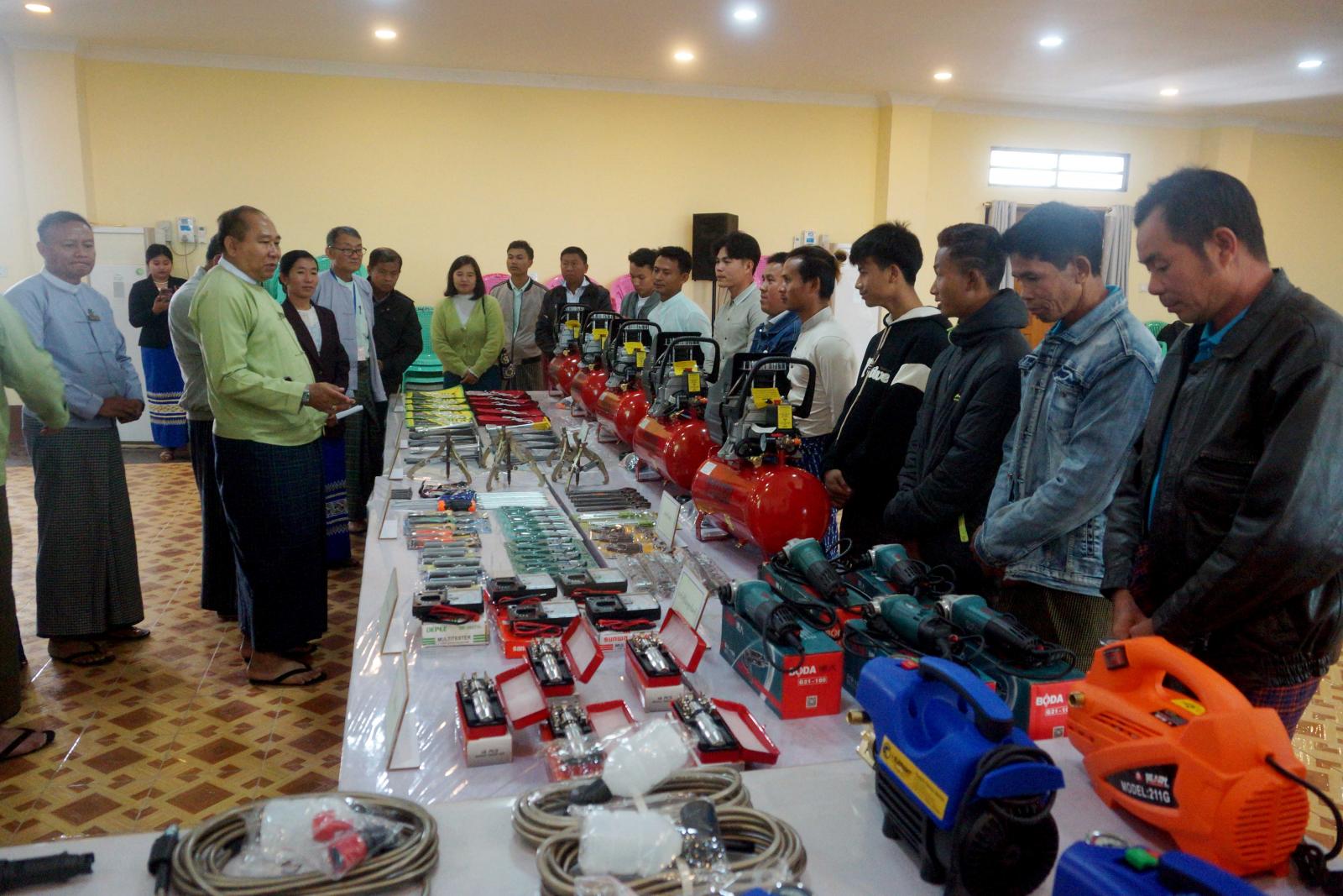ဆက်လက်၍ သင်တန်းဆင်းပွဲတွင် ဆိုင်ကယ်ပြုပြင်လုပ်ငန်းထူထောင်လုပ်ကိုင်ကြမည့် သင်တန်းသားများကိုပေးအပ်ရန် ခင်းကျင်းပြသထားသည့် ပစ္စည်းအမျိုးအမည်(၉)မျိုးအပြင် လက်သုံးကိရိယာပစ္စည်းမျိုးစုံကို ခရိုင်စီမံအုပ်ချုပ်ရေးအဖွဲ့ဥက္ကဋ္ဌနှင့်တာဝန်ရှိသူများက လှည့်လည်ကြည့်ရှု အားပေးခဲ့ကြကြောင်း သိရသည်။