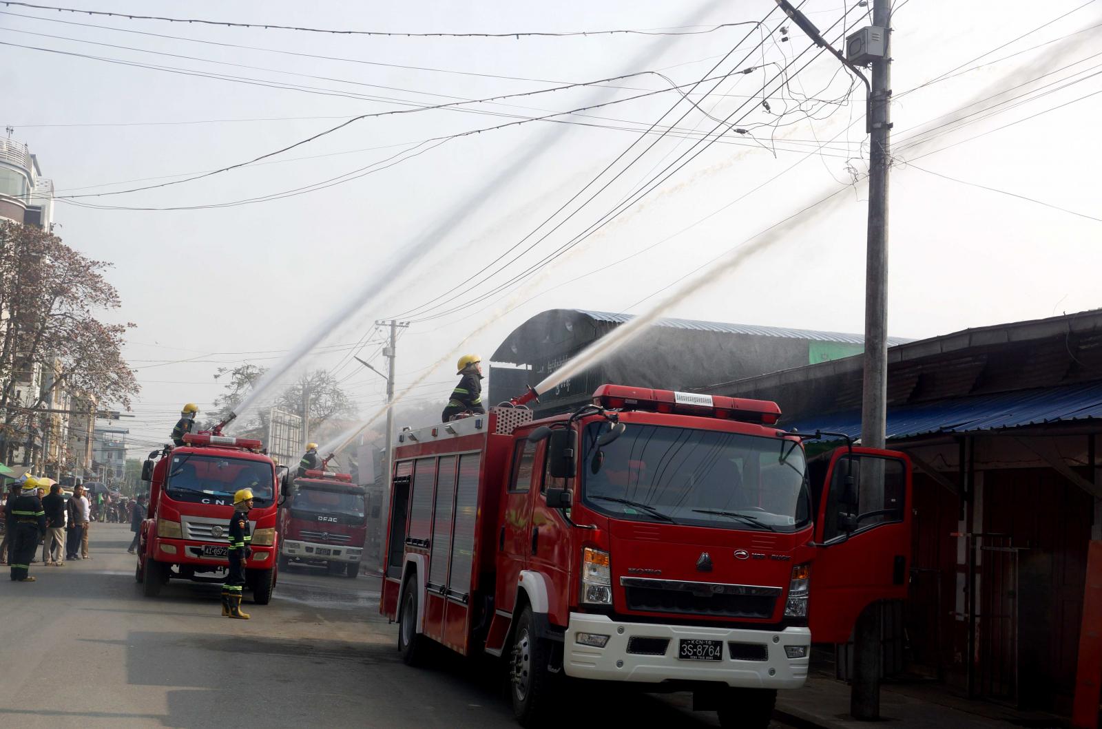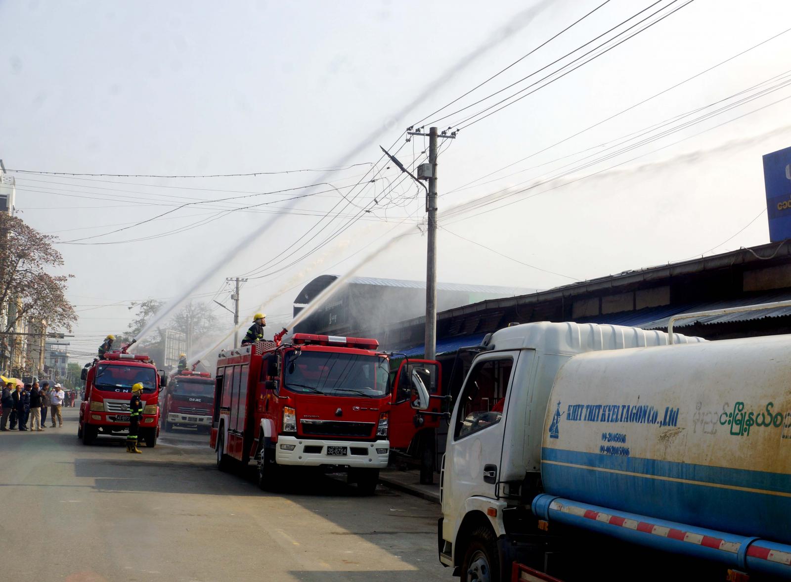 ထို့နောက် မီးဘေးအန္တရာယ် ကြိုတင်ကာကွယ်ရေး သဏ္ဍာန်တူသရုပ်ပြ ဇာတ်တိုက်လေ့ကျင့်ခြင်းဆောင်ရွက်ရာ၌ ခရိုင်မီးသတ်ဦးစီးဌာနမှ မီးငြိမ်းသတ်ယာဉ် (၅) စီး၊ ရေသယ်ယာဉ် (၂)စီး၊ အရန်မီးသတ်တပ်ဖွဲ့မှ ရေသယ်ယာဉ် (၁) စီးနှင့် စည်ပင်သာယာရေးအဖွဲ့မှ ရေသယ်ယာဉ် (၁) စီး စုစုပေါင်း (၉) စီးတို့ဖြင့် သရုပ်ပြသခြင်းများ ဆောင်ရွက်ခဲ့ကြကြောင်း သိရသည်။