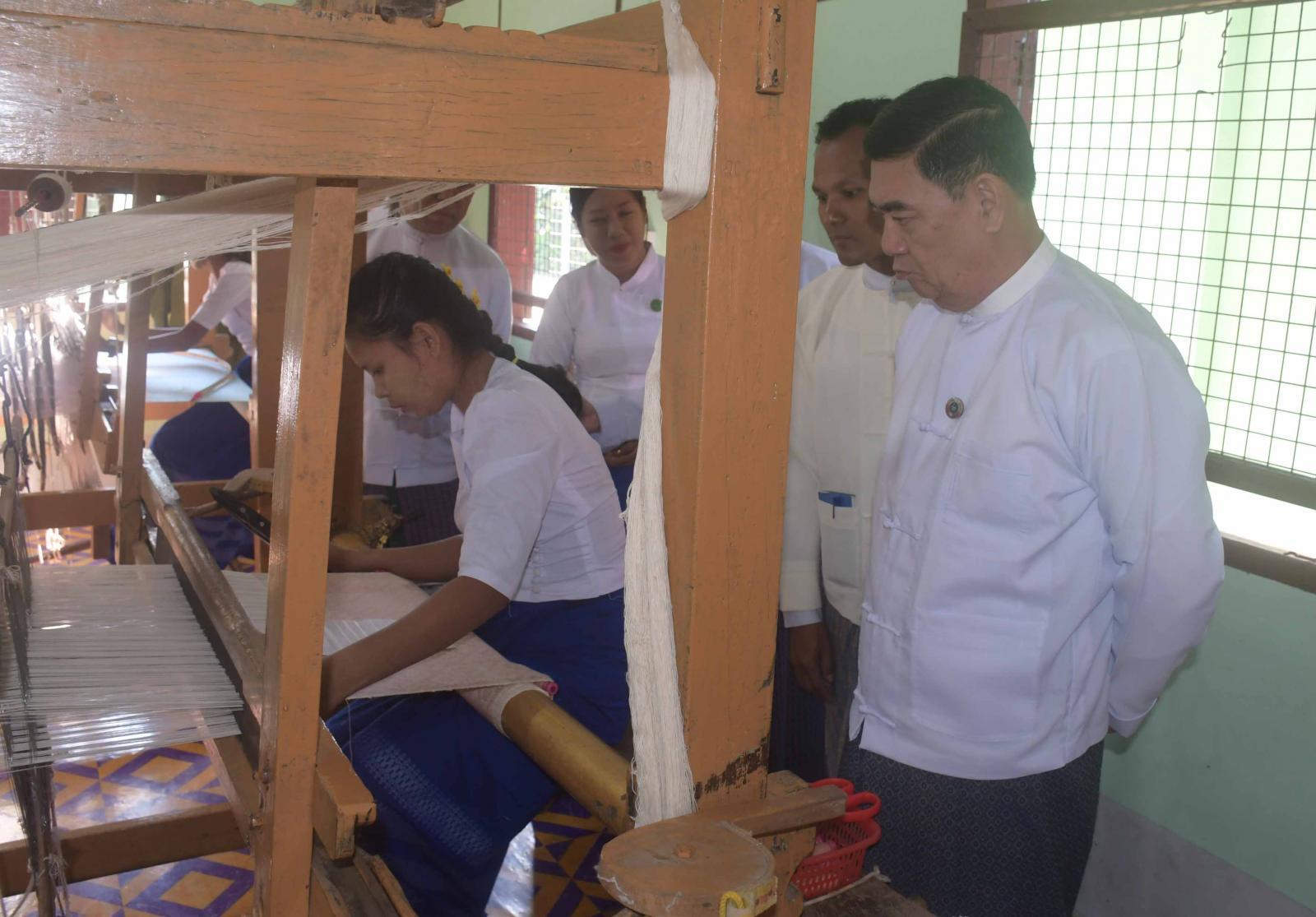 ဦးစွာ ပြည်နယ်ဝန်ကြီးချုပ်နှင့်အဖွဲ့သည် သင်တန်းသူများအား လက်ရက်ကန်း လက်တွေ့ သင်ကြားပို့ချနေမှုကို လှည့်လည်ကြည့်ရှုအားပေးကြရာ အသေးစားစက်မှုလုပ်ငန်းဦးစီးဌာန၊ ပြည်နယ်ဦးစီးမှူးနှင့် ရက်ကန်းနှင့်အသက်မွေးပညာသင်တန်းကျောင်း(စစ်တွေ)ကျောင်းအုပ်ကြီး တို့က လိုက်လံရှင်းလင်းတင်ကြပြပြီး ပြည်နယ်လမ်းပန်းဆက်သွယ်ရေးဝန်ကြီးက ဖြည့်စွက်ရှင်းလင်းတင်ပြသည်။ ပြည်နယ်ဝန်ကြီးချုပ်က ရိုးရာရက်ကန်းလုပ်ငန်းများကို စနစ်တကျလုပ်ဆောင်ကာ ရိုးရာအဝတ်အထည်များ ပိုမိုထုတ်လုပ်နိုင်ရေး ဆောင်ရွက်သွားရန်၊ လူငယ်များအလုပ်အကိုင်အခွင့်အလမ်း ပိုမိုရရှိလာနိုင်ရေးအတွက် ရက်ကန်းသင်တန်းများဖွင့်လှစ်ကာ မျိုးဆက်သစ်လူငယ်များကို လက်ဆင့်ကမ်း သင်ကြားပေးသွားကြရန်မှာကြားသည်။