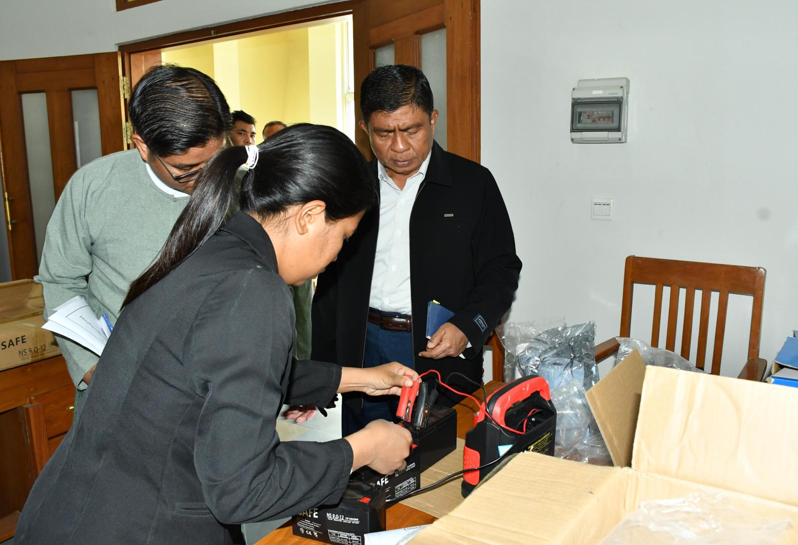 ရှေးဦးစွာ ပြည်နယ်တာဝန်ခံနှင့် တာဝန်ရှိသူများသည် ပြည်နယ်လွှတ်တော်ရုံး၌ မြန်မာအီလက်ထရောနစ်မဲပေးစက်များနှင့် ဆက်စပ်ပစ္စည်းများကို တာဝန်ရှိသူများက စနစ်တကျစစ်ဆေး၍ ပြန်လည်အပ်နှံထားရှိမှု အခြေအနေများနှင့် မဲပေးစက်တွင် အသုံးပြုခဲ့သည့် (၁၂)ဗို့ ဘက်ထရီအိုးများကို ပြန်လည်အားသွင်း၍ စစ်ဆေးဆောင်ရွက်နေမှု အခြေအနေများကို လှည့်လည် ကြည့်ရှုစစ်ဆေးခဲ့ကာ လိုအပ်သည်များကို တာဝန်ရှိသူများနှင့် ပေါင်းစပ်ညှိနှိုင်းဆောင်ရွက်ပေးခဲ့သည်။