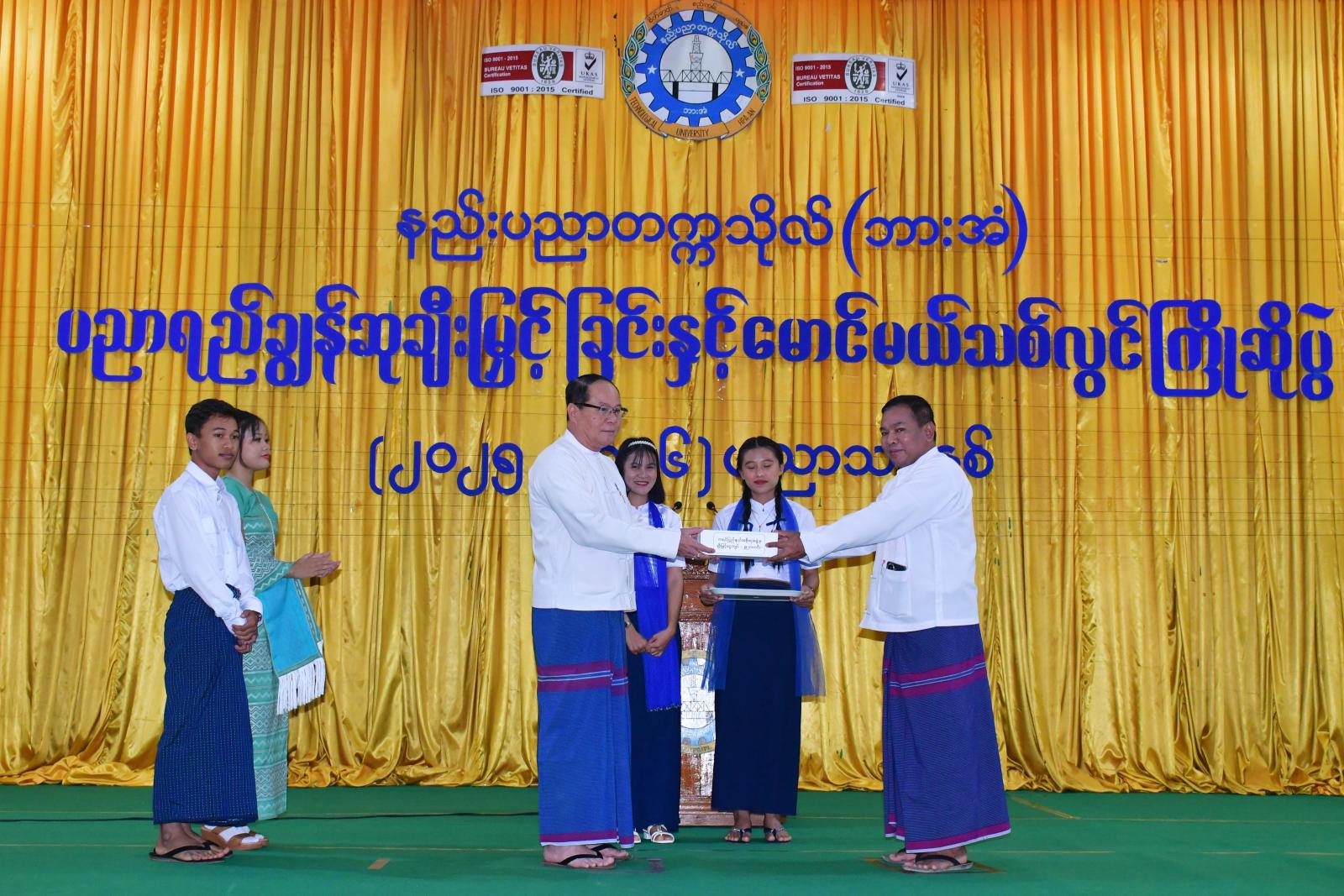ဦးစွာ ပြည်နယ်ဝန်ကြီးချုပ်က နိုင်ငံနှင့်လူမျိုးအတွက် ဂုဏ်တင့်တယ်စေမည့် ဉာဏ်ရည်၊ နှလုံးရည်၊ တွေးခေါ် မြော်မြင်ဆင်ခြင်နိုင်မှုစွမ်းအားများ မြင့်မားသော နိုင်ငံတော်အတွက် ကောင်းကျိုးပြုနိုင်မည့် အရည်အသွေးမြင့်မားသော ထူးချွန်ထက်မြတ်သည့် အင်ဂျင်နီယာပညာရှင်များဖြစ်အောင် ကြိုးစားကြစေလိုကြောင်း တိုက်တွန်းပြောကြားပြီး ပထမနှစ်မောင်မယ်သစ်လွင် ကျောင်းသား၊ကျောင်းသူ ၁၆၄ ဦးအတွက် ငွေကျပ် ၂၉၂၀၀၀ဝ(နှစ်ဆယ့်ကိုးသိန်း နှစ်သောင်းကျပ်)ကို ဒုတိယပါမောက္ခချုပ်ဒေါက်တာအောင်ဇော်လတ်နှင့်ကျောင်းသား၊ကျောင်းသူများထံ ချီးမြှင့်ပေးအပ် သည်။