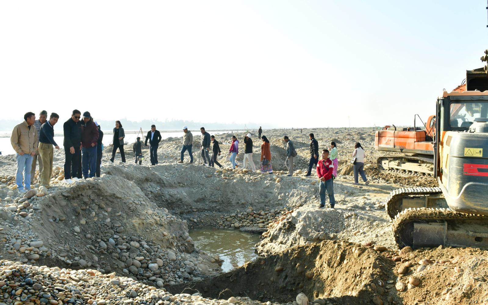 ယင်းနောက် ပြည်နယ်ဝန်ကြီးချုပ်၊ ပြည်နယ်အစိုးရအဖွဲ့ဝင် ဝန်ကြီးများနှင့် ဌာနဆိုင်ရာတာဝန်ရှိသူများသည် ဗလမင်းထင်တံတားအောက်ရှိ သဲသောင်ဖြစ်ထွန်းမှုများအား မြစ်ကြောင်းရှင်းလင်းရေးလုပ်ငန်း သောင်တူးဖော်ခြင်းလုပ်ငန်းအတွက် စက်ယန္တရားကြီးများဖြင့် ကြိုတင်ပြင်ဆောင် ရွက်နေမှုအခြေအနေများအား လှည့်လည်ကြည့်ရှုစစ်ဆေးခဲ့ကြပြီး ပြည်နယ်ဝန်ကြီးချုပ်က ရေအရင်း အမြစ်နှင့်မြစ်ချောင်းများဖွံ့ဖြိုးတိုးတက်ရေးဦးစီးဌာနက သတ်မှတ်ထားသည့် အလျား (၄၂၀၀)ပေ၊ အကျယ် (၁၃၅)ပေနှင့် အနက် ရေစစ်မျဉ်းအောက် (၂)မီတာ ပြည့်မီအောင် တူးဖော်ဆောင်ရွက်နိုင်ရေးအတွက် လိုအပ်သည်များကို သက်ဆိုင်ရာတာဝန်ရှိသူများနှင့် ပေါင်းစပ်ညှိနှိုင်း ဆောင်ရွက်ပေးခဲ့ သည်။