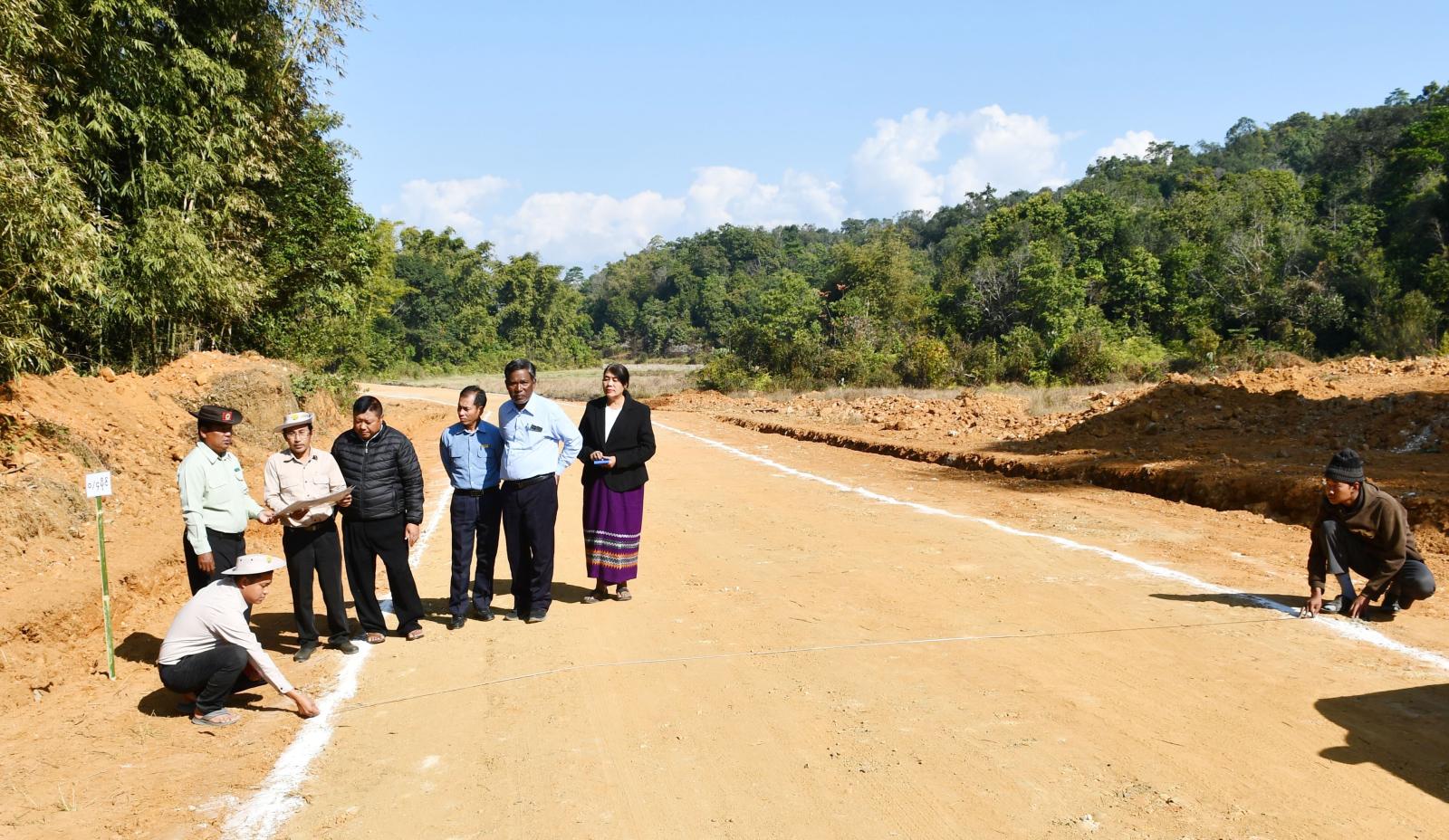 ဆက်လက်၍ ခရိုင်လမ်း၊ တံတားတည်ဆောက်ရေးလုပ်ငန်းစစ်ဆေးရေးအဖွဲ့ ဥက္ကဋ္ဌ ဦးစိုးထွန်းနှင့် အဖွဲ့ဝင်များသည် ၂၀၂၅-၂၀၂၆ ဘဏ္ဍာရေးနှစ် ပြည်နယ်ငွေလုံးငွေရင်းရန်ပုံငွေ ကျပ်သန်းပေါင်း(၄၆၀ ဒဿမ ၄၃၈) သန်းဖြင့် ပူတာအိုမြို့နယ်၊ နမ်ရှယ်ရှီးဒီကျေးရွာနှင့် နမ်ရှယ်စွပ်ကျေးရွာ ချင်းဆက်သွယ်လမ်းအရှည်(၁)မိုင်(၁) ဖာလုံအား သဲကျောက်လမ်းခင်းခြင်းလုပ်ငန်းကို JSJ ကုမ္ဗဏီက သဲကျောက်လမ်းခင်းခြင်းလုပ်ငန်း(၇၀)ရာခိုင်နှုန်း လုပ်ငန်းဆောင်ရွက်ပြီးစီးမှု အခြေအနေများအား ကွင်းဆင်းစစ်ဆေးပြီး ခရိုင်ကျေးလက်လမ်းဖွံ့ဖြိုးရေးဦးစီးဌာန ခရိုင်ဦးစီးမှူး ဦးဗိုလ်ဗိုလ်ကျော်နှင့် JSJ ကုမ္ဗဏီမှ တာဝန်ရှိသူများက လုပ်ငန်းဆောင်ရွက်ပြီးစီးမှု အခြေအနေများနှင့် လုပ်ငန်းလိုအပ်ချက်များကို ရှင်းလင်းတင်ပြကြရာ ခရိုင်လမ်း၊ တံတားတည်ဆောက်ရေးလုပ်ငန်း စစ်ဆေးရေးအဖွဲ့ ဥက္ကဋ္ဌက သတ်မှတ်အရည်အသွေးပြည့်မီရေး၊ အချိန်မီပြီးစီးရေးနှင့် လုပ်ငန်းခွင်အန္တရာယ်ကင်းရှင်းရေးတို့ကို ဆွေးနွေးမှာကြားသည်။