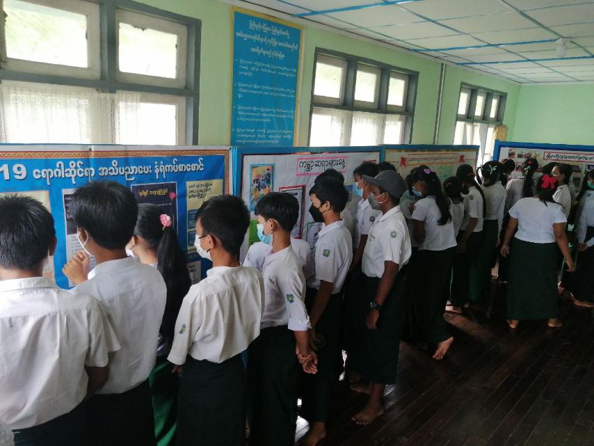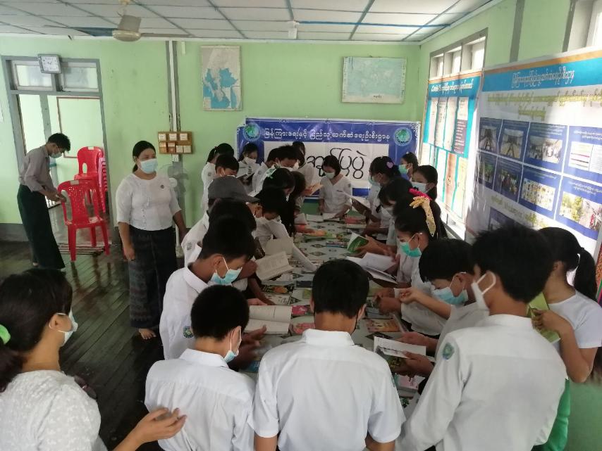 ထို့နောက် ပြန်ကြားရေးနှင့်ပြည်သူ့ဆက်ဆံရေးဦးစီးဌာန၊ သုံးခွမြို့နယ်ရုံးက ပြသထားသောစာအုပ်ပြပွဲနှင့် နံရံကပ်စာစောင်ပြပွဲကို ဆရာ/ဆရာမများနှင့် ကျောင်းသား/သူ (၃၅)ဦးတို့က စိတ်ဝင်စားစွာကြည့်ရှုလေ့လာခဲ့ကြသည်။