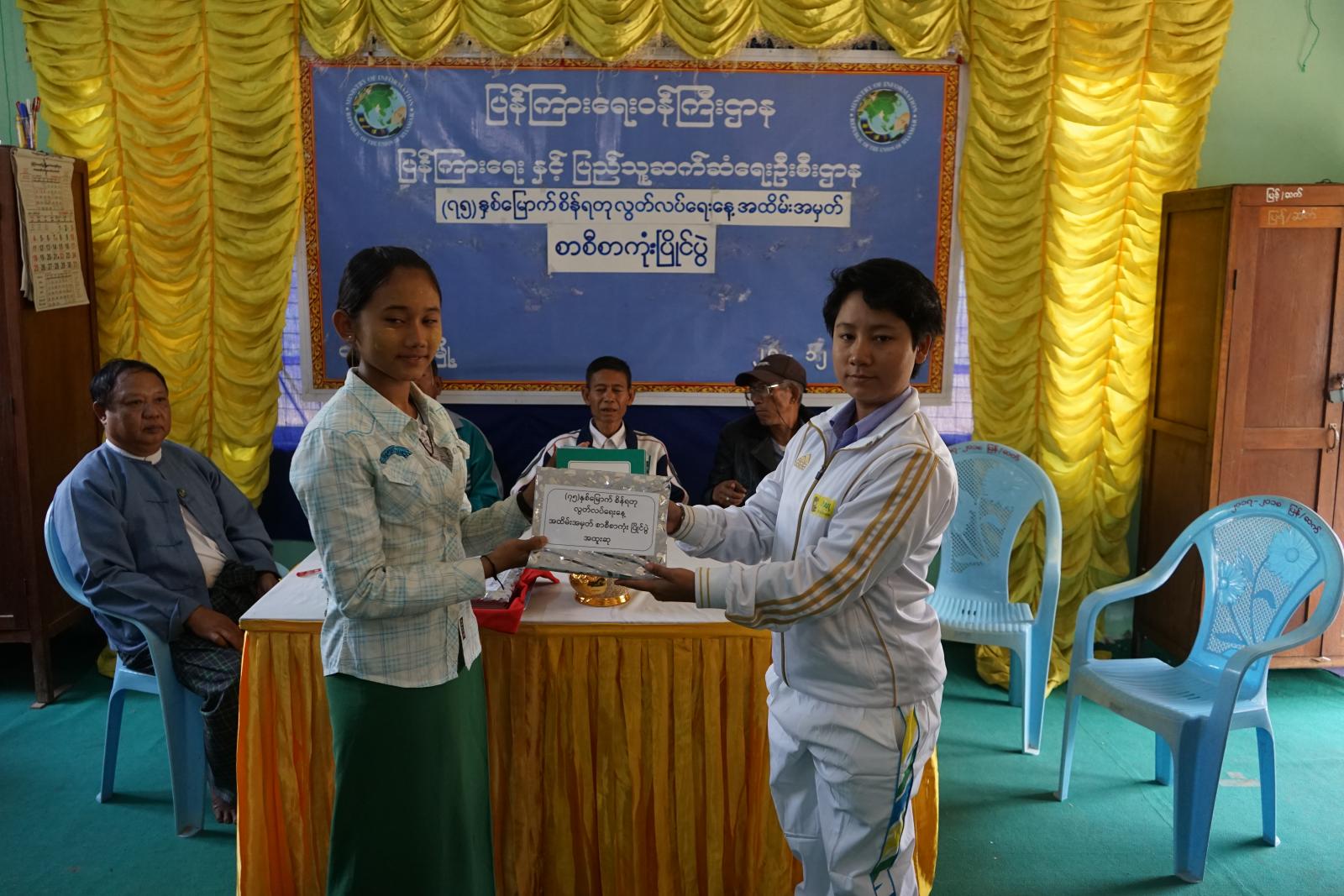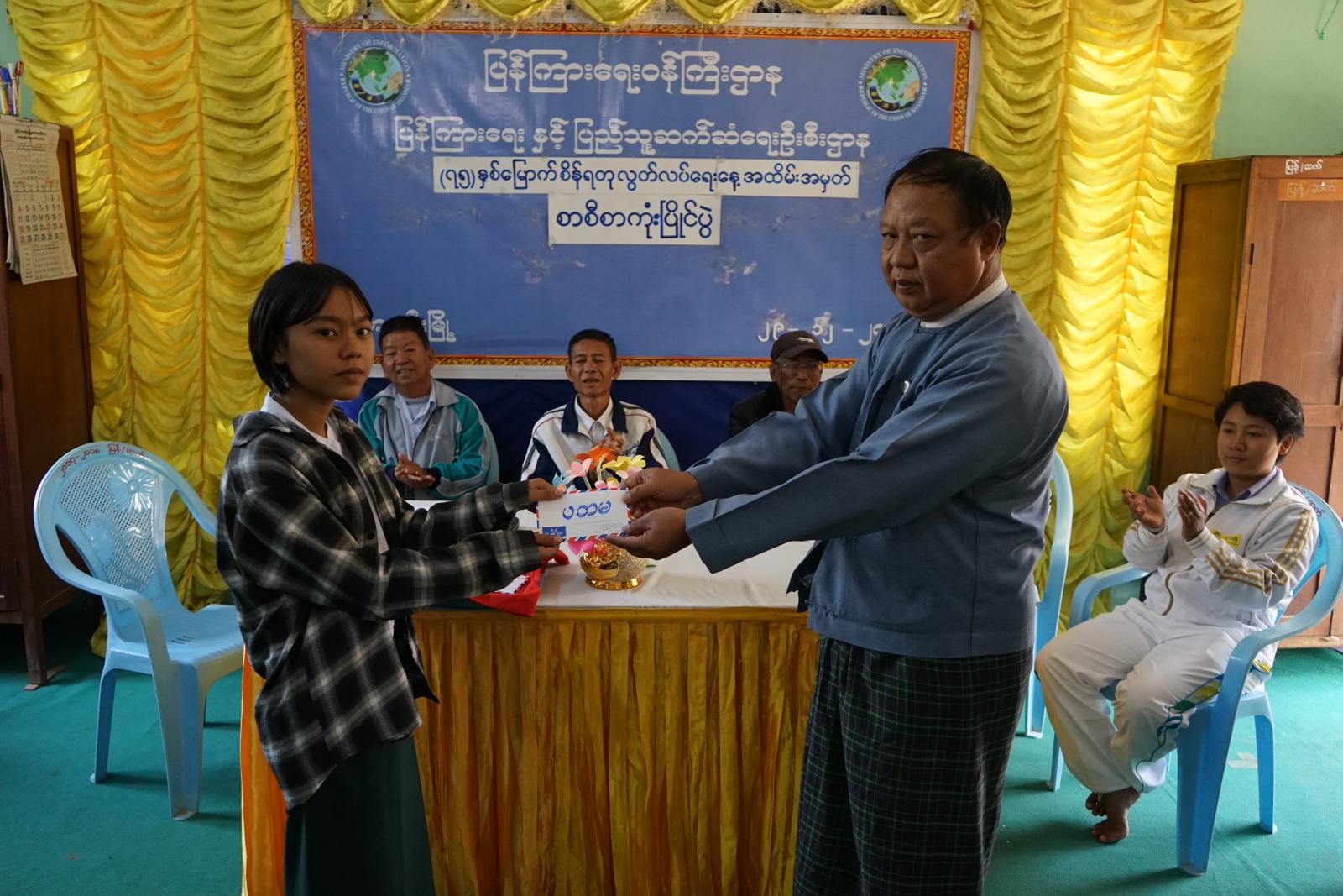 ဆုချီးမြှင့်ပွဲတွင် မြို့နယ်ပြန်ကြားရေးနှင့်ပြည်သူ့ဆက်ဆံရေးဦးစီးဌာန ဦးစီးအရာရှိ ဦးဘိုမောင်က စာစီစာကုံးပြိုင်ပွဲ၌ ဆုချီးမြှင့်ခြင်း ရည်ရွယ်ချက်များကို ရှင်းလင်းပြောကြားသည်။