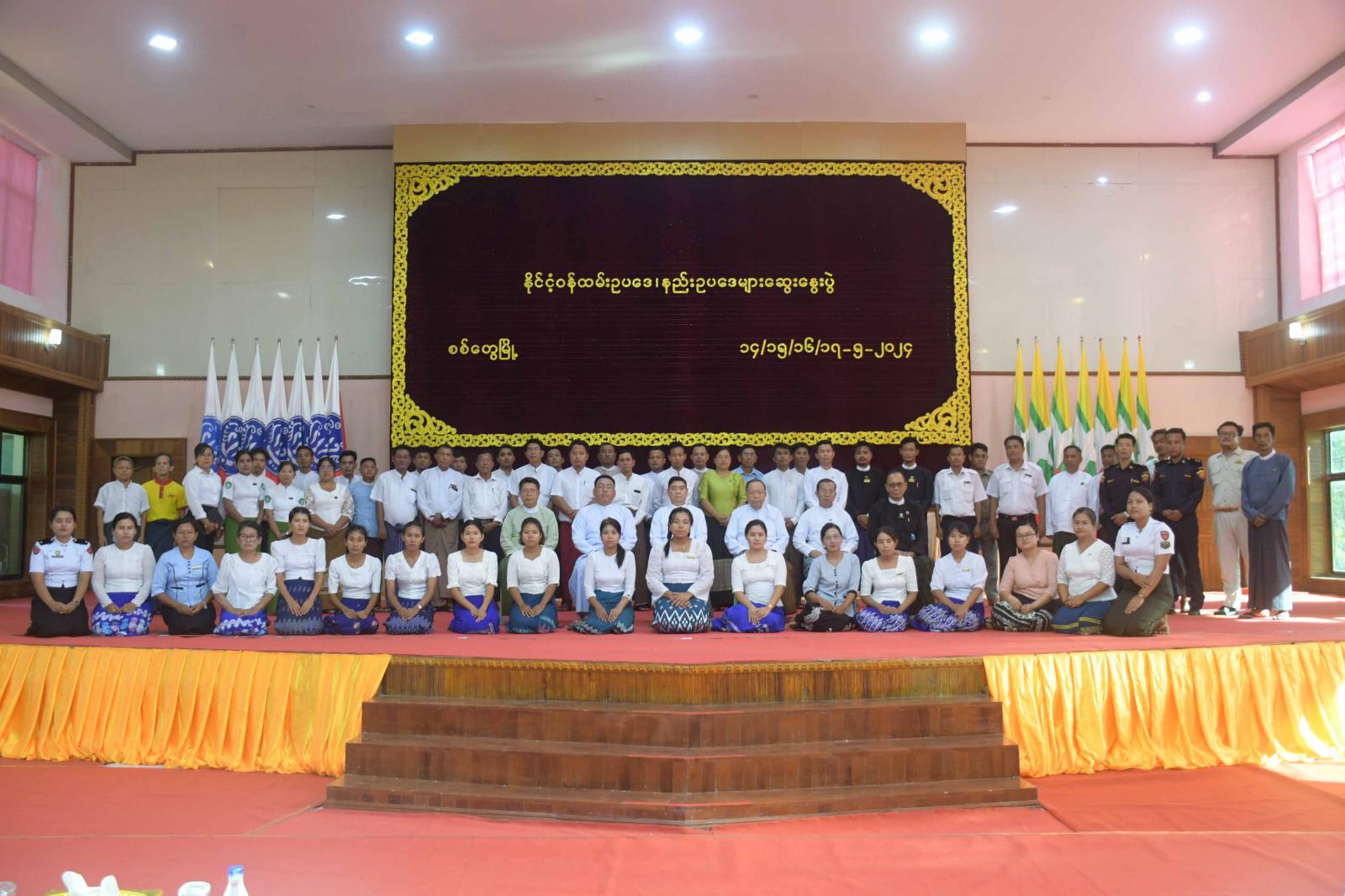 နိုင်ငံ့ဝန်ထမ်းဥပဒေ၊ နည်းဥပဒေများဆွေးနွေးပွဲ ပိတ်ပွဲကို မေလ ၁၇ ရက်နေ့ ညနေပိုင်းက စစ်တွေမြို့၊ ခိုင်သဇင်ခန်းမ၌ကျင်းပရာ ရခိုင်ပြည်နယ်ဝန်ကြီးချုပ် ဦးထိန်လင်း၊ ပြည်နယ်အစိုးရအဖွဲ့ ဝင်များ၊ ပြည်နယ်အဆင့်ဌာနဆိုင်ရာများနှင့် သင်တန်းသား၊ သင်တန်းသူများ တက်ရောက်ကြသည်။