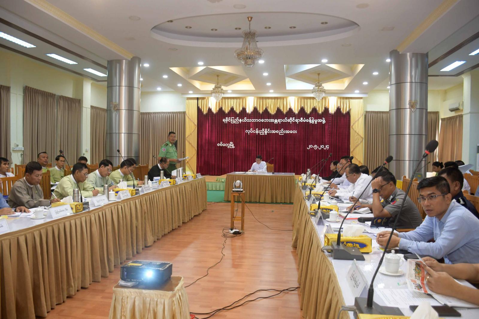 ရခိုင်ပြည်နယ် သဘာဝဘေးအန္တရာယ်ဆိုင်ရာ စီမံခန့်ခွဲမှုအဖွဲ့ လုပ်ငန်းညှိနှိုင်းအစည်းအဝေးကို ယနေ့နံနက်ပိုင်းက ရခိုင်ပြည်နယ်အစိုးရ အဖွဲ့ရုံး အစည်းအဝေးခန်းမ၌ကျင်းပရာ ရခိုင်ပြည်နယ် သဘာဝဘေးအန္တရာယ်ဆိုင်ရာ စီမံခန့်ခွဲမှုအဖွဲ့ဥက္ကဋ္ဌ၊ ရခိုင်ပြည်နယ်ဝန်ကြီးချုပ် ဦးထိန်လင်း၊ ပြည်နယ်တရားလွှတ်တော်တရားသူကြီးချုပ်၊ ပြည်နယ်အစိုးရအဖွဲ့ဝင်များ၊ ကော်မတီဝင်များနှင့် ဌာနဆိုင်ရာ တာဝန်ရှိသူများတက်ရောက်ကြပြီး ခရိုင်စီမံ အုပ်ချုပ်ရေးအဖွဲ့ဥက္ကဋ္ဌများက Video Conference စနစ်ဖြင့်တက်ရောက်ကြသည်။