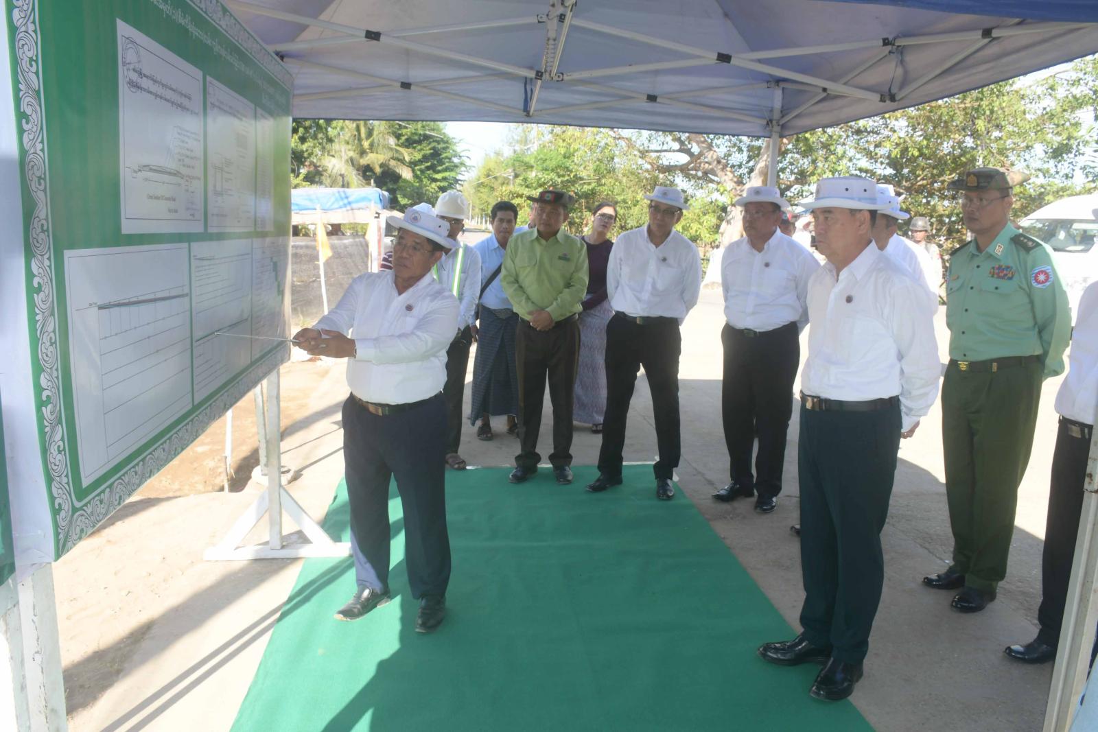ဦးစွာ ပြည်နယ်စည်ပင်သာယာရေးအဖွဲ့၊ ညွှန်ကြားရေးမှူး ကွန်ကရစ်လမ်းခင်းခြင်း လုပ်ငန်းဆောင်ရွက်နေမှုနှင့် ပတ်သက်၍ ရှင်းလင်းတင်ပြီး ပြည်နယ်သယံဇာတရေးရာ ဝန်ကြီးက ဖြည့်စွက် ရှင်းလင်းတင်ပြသည်။ တင်ပြချက်များအပေါ် ပြည်နယ်ဝန်ကြီးချုပ်က လုပ်ငန်းများကို သတ်မှတ်စံချိန်စံညွှန်းပြည့်မီရေး၊ အချိန်မီပြီးစီးနိုင်ရေး စေတနာထားဆောင်ရွက်သွားကြရန်မှာကြားပြီး လုပ်ငန်းဆောင်ရွက်နေမှုများအား လှည့်လည်ကြည့်ရှုစစ်ဆေးကြသည်။