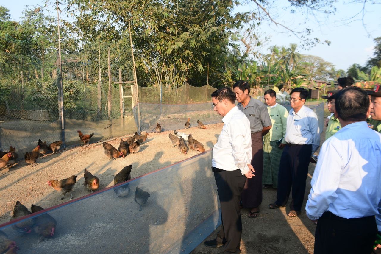 ထို့နောက် ပဲခူးတိုင်းဒေသကြီး ဝန်ကြီးချုပ်နှင့် တာဝန်ရှိသူများသည် ဒိုက်ဦးမြို့နယ်၊ အိမ်ခြေလေးဆယ်ကျေးရွာ၌ မွေးမြူရေးလုပ်ငန်းရှင် ဦးတင်ထွဋ်မြင့်မှ ဒေသထွက်အစာဖြင့် ယူနန်ကြက်ကောင်ရေ (၁၀၀) စမ်းသပ်မွေးမြူနေမှုနှင့် ဒေသကြက်ကောင်ရေ (၃၀၀၀) မွေးမြူထားရှိမှုတို့အား ကွင်းဆင်းကြည့်ရှုအားပေးခဲ့ပြီး ဒေသတွင်းအသားစားသုံးမှုဖူလုံစေရေး၊ လူတိုင်းလိုအပ်သည့် အသားပမာဏအား ဈေးနှုန်းသက်သာစွာ ဝယ်ယူစားသောက်နိုင်ရေးအတွက် ဒေသကြက်တိုးချဲ့မွေးမြူရန်နှင့် ဒေသထွက်ကုန်ကြမ်း ပစ္စည်းများဖြင့် တိရိစ္ဆာန်အစာကိုယ်တိုင်ထုတ်လုပ်မွေးမြူနိုင်ရေး တာဝန်ရှိသူများနှင့် ပေါင်းစပ်ညှိနှိုင်း ဆောင်ရွက်ပေးခဲ့သည်။ ၎င်းနောက် TBL စပ်မျိုးနေကြာမျိုးစေ့ထုတ်စိုက်ခင်းသို့ သွားရောက်ကြည့်ရှုအားပေးခဲ့ပြီး ဆီထွက်သီးနှံနေကြာအား သတ်မှတ်ဧကအတိုင်း ပြည့်မီစွာစိုက်ပျိုးသွားရန်နှင့် စိုက်ပျိုးဧကအလိုက် ပန်းတိုင်အထွက်နှုန်းပြည့်မီစေရေး အထူးအလေးထား ဆောင်ရွက်ရန် လမ်းညွှန်မှာကြားခဲ့သည်။