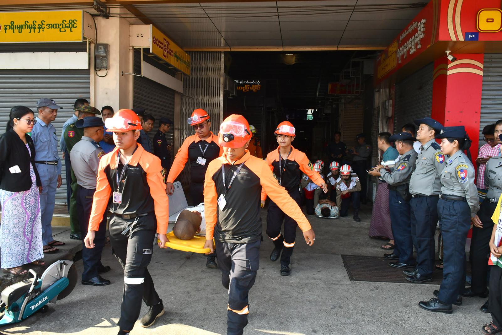 သရုပ်ပြဇာတ်တိုက်လေ့ကျင့်ဆောင်ရွက်ရာတွင် ဆိပ်ငယ်ဈေးအတွင်းပိုင်းနှင့် အပြင်ပိုင်းနှစ်ပိုင်းခွဲ၍ ပြုလုပ်ခဲ့ကြပြီး ဈေးအတွင်း Fire Point (ဆီဗန်းမီးလောင်မှု)အား ဈေးသူ/သားများနှင့် ဈေးသီးသန့်မီးသတ်တပ်ဖွဲ့မှ မီးသတ်ဆေးဘူးများဖြင့် ငြှိမ်းသတ်ခြင်းနှင့် ရေပက်ပိုက်ဖြင့် ငြှိမ်းသတ်ခြင်းပြုလုပ်ကြသည်။ ထို့နောက် မီးသတ်တပ်ဖွဲ့ဝင်များမှ မီးငြှိမ်းသတ်ယာဉ်နှင့်ရှာဖွေကယ်ဆယ်ရေးယာဉ်များ ရောက်ရှိကြပြီး ဈေးအတွင်းပိုင်း မီးလောင်မှုအားငြှိမ်းသတ်ခြင်း၊ ဈေးအတွင်းပိုင်းရှိ လူနာကယ်ထုတ်ခြင်းနှင့် ဒဏ်ရာရလူနာများအား ကြက်ခြေနီတပ်ဖွဲ့သို့ လွှဲပြောင်း၍ လူနာများကိုရှေးဦးပြုစုခြင်းနှင့် လူနာတင်ယာဉ်ဖြင့် ဆေးရုံသို့ပို့ဆောင်ခြင်းကို ဇာတ်တိုက်သရုပ်ပြဆောင်ရွက်ကြသည်။