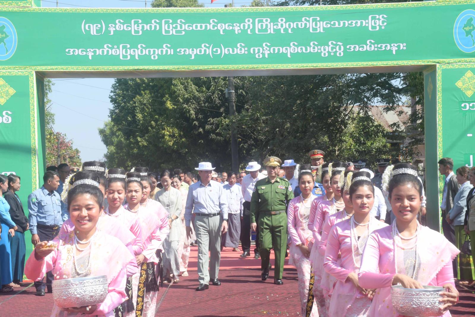 ဦးစွာ ပြည်နယ်စည်ပင်သာယာရေးအဖွဲ့၊ ညွှန်ကြားရေးမှူး ဦးကျော်မိုးက ကွန်ကရစ်လမ်းသစ်ဆောင်ရွက်ပေးခြင်းနှင့်ပတ်သက်၍ ရှင်းလင်းတင်ပြပြီး ပြည်နယ်ဝန်ကြီးချုပ်နှင့် တိုင်းမှူးတို့အား ပြည်နယ်သယံဇာတရေးရာဝန်ကြီးက လမ်းဖွင့်ပွဲအထိမ်းအမှတ်အလံများ ပေးအပ်ကြသည်။ ဆက်လက်ပြီး စည်ပင်သာယာရေးအဖွဲ့မှ တာဝန်ရှိသူများက လမ်းဖွင့်ပွဲအထိမ်းအမှတ်အလံများ ပေးအပ်ကြသည်။ ယင်းနောက် ရပ်ကွက်နေပြည်သူတစ်ဦးက လမ်းအဆင့်မြှင့်တင်ကာ ဖွင့်လှစ်ပေးခြင်းအပေါ် ကျေးဇူးတင်စကား ပြောကြားသည်။