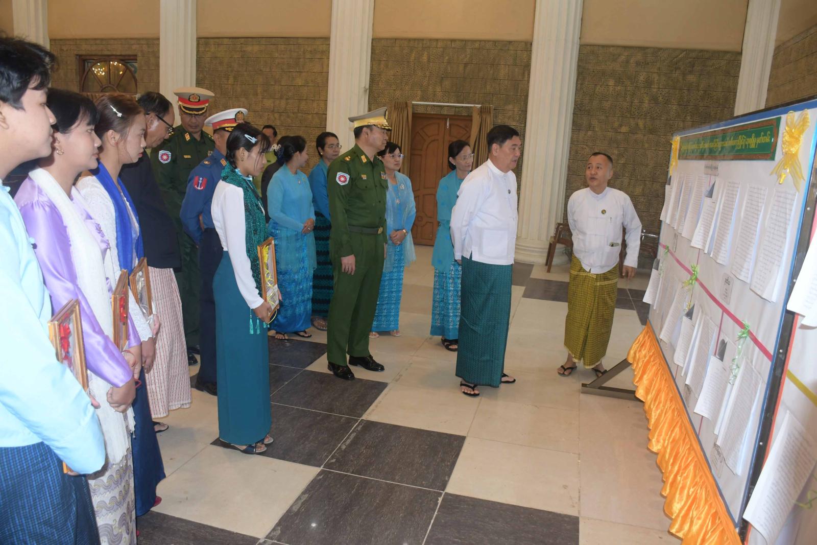 ယင်းနောက် ပြည်နယ်ဝန်ကြီးချုပ်နှင့်ဇနီး၊ တိုင်းမှူးနှင့်တာဝန်ရှိသူများသည် အခမ်းအနားသို့ တက်ရောက်လာကြသူများအား ရင်းရင်းနှီးနှီးတွေ့ဆုံနှုတ်ဆက်ကြပြီး စာစီစာကုံးပြိုင်ပွဲတွင် ဆုရရှိကြသူများ၏ စာစီစာကုံးစာမူများကို လှည့်လည်ကြည့်ရှုခဲ့ကြကြောင်း သတင်းရရှိသည်။