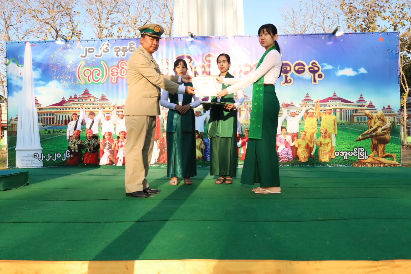 ရှေ့ဦးစွာ ပြည်ထောင်စုသမ္မတမြန်မာနိုင်ငံတော်အလံအားအလေးပြု၍ ပြည်ထောင်စုသမ္မတ မြန်မာနိုင်ငံတော်၊ ယာယီသမ္မတ၊ နိုင်ငံတော်လုံခြုံရေးနှင့်အေးချမ်းသာယာရေးကော်မရှင်ဥက္ကဋ္ဌ ဗိုလ်ချုပ်မှူးကြီး သတိုးမဟာသရေစည်သူ သတိုးသီရိသုဓမ္မမင်းအောင်လှိုင်ထံမှ (၇၉)နှစ်မြောက် ပြည်ထောင်စုနေ့အခမ်းအနားသို့ပေးပို့သည့် သဝဏ်လွှာအား ခရိုင်စီမံခန့်ခွဲရေးနှင့်အုပ်ချုပ်ရေးကော်မတီဥက္ကဋ္ဌ ဦးမြင့်နိုင်ကဖတ်ကြားခဲ့သည်။ ဆက်လက်၍ (၇၉) နှစ်မြောက် ပြည်ထောင်စုနေ့အထိမ်းအမှတ် အခြေခံပညာအထက်တန်းအဆင့်၊ အလယ်တန်းအဆင့်၊ မူလတန်းအဆင့် စာစီစာကုံးပြိုင်ပွဲနှင့် ကဗျာပြိုင်ပွဲတို့တွင် ဆုရရှိကြသည့် ကျောင်းသား၊ ကျောင်းသူများကို တာဝန်ရှိသူများက ဂုဏ်ပြုဆုများပေးအပ်ချီးမြှင့်ခဲ့ကြသည်။
