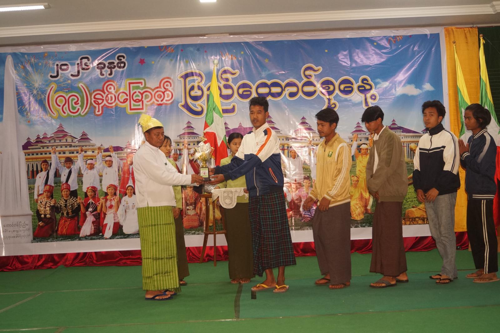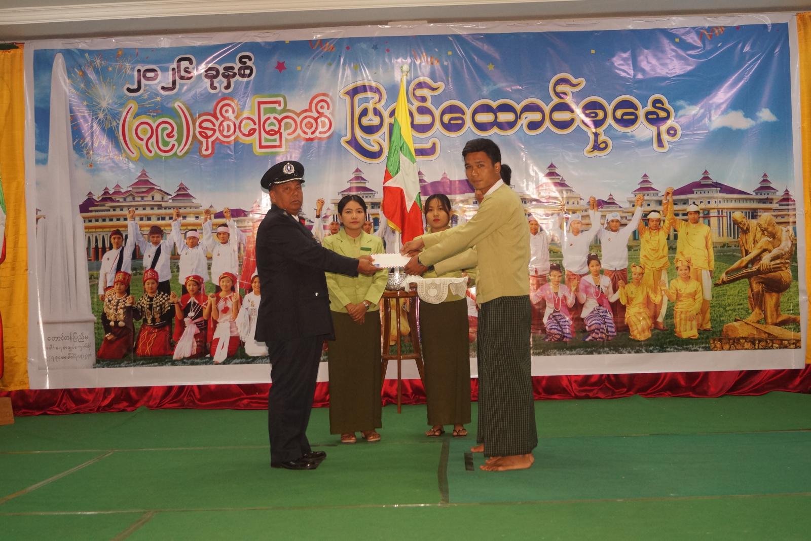နံနက် ၆ နာရီတွင် ခရိုင်စုပေါင်းရုံး ရွှေဆည်မြိုင်ခန်းမ၌ သဝဏ်လွှာဖတ်ပွဲအခမ်းအနားကို ဆက်လက်ကျင်းပရာ (၇၉)နှစ်မြောက် ပြည်ထောင်စုနေ့အထိမ်းအမှတ် ပြည်ထောင်စုသမ္မတမြန်မာနိုင်ငံတော် ယာယီသမ္မတ နိုင်ငံတော်လုံခြုံရေးနှင့်အေးချမ်းသာယာရေးကော်မရှင်ဥက္ကဋ္ဌ ဗိုလ်ချုပ်မှူးကြီး သတိုးမဟာသရေစည်သူ သတိုးသီရိသုဓမ္မမင်းအောင်လှိုင်ထံမှ ပေးပို့သောသဝဏ်လွှာအား ခရိုင်စီမံခန့်ခွဲရေးနှင့်အုပ်ချုပ်ရေးကော်မတီဥက္ကဋ္ဌ ဦးကိုကိုလှိုင်ကဖတ်ကြားသည်။ ယင်းနောက် ပြည်ထောင်စုနေ့အထိမ်းအမှတ် အလွတ်တန်းပိုက်ကျော်ခြင်းပြိုင်ပွဲ၌ ပထမဆုရ မြို့မ(၁)အသင်းအား ခရိုင်စီမံခန့်ခွဲရေးနှင့်အုပ်ချုပ်ရေးကော်မတီဥက္ကဋ္ဌ ဦးကိုကိုလှိုင်ကလည်းကောင်း၊ ဒုတိယဆုရ ခရိုင်ထွေ/အုပ်အသင်းအား ခရိုင်စီမံခန့်ခွဲရေးနှင့်အုပ်ချုပ်ရေးကော်မတီ အတွင်းရေးမှူး ဒုတိယရဲမှူးကြီး သန်းကျော်ကလည်းကောင်း ချီးမြှင့်ပေးအပ်ခဲ့ကြောင်း သိရသည်။