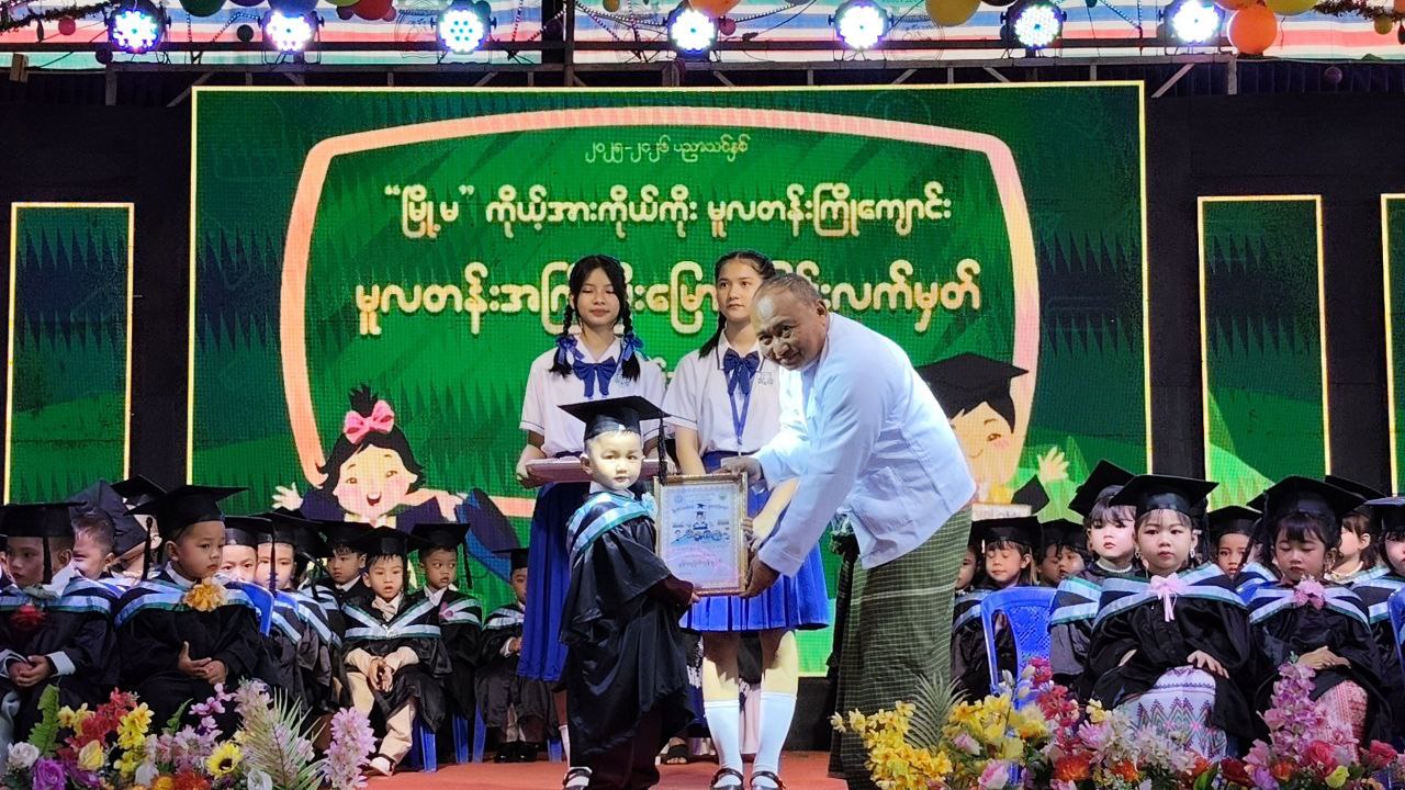 ကရင်ပြည်နယ်၊ မြဝတီခရိုင်၊ မြဝတီမြို့ ပညာရွှေဖူးကိုယ်ပိုင်အလယ်တန်းကျောင်းတွင် ယနေ့နံနက် (၈) အချိန်၌ မြို့မကိုယ့်အားကိုယ်ကိုး မူလတန်းကြိုကျောင်း၏ ၂၀၂၅-၂၀၂၆ပညာသင်နှစ် မူလတန်းပြီးမြောက်ခြင်း လက်မှတ်ပေးအပ်သည့်အခမ်းအနားကိုကျင်းပခဲ့ရာ ခရိုင်စီမံခန့်ခွဲရေးနှင့်အုပ်ချုပ်ရေးကော်မတီ၊ အဖွဲ့ဝင် ၂ ဦးစိန်သောင်း၊ မြို့နယ်စီမံခန့်ခွဲရေးနှင့်အုပ်ချုပ်ရေးကော်မတီဥက္ကဋ္ဌ မြို့နယ်အုပ်ချုပ်ရေးမှူး ဦးဇော်မော်အောင်၊ ခရိုင်ပညာရေးမှူး ဦးစောဝါးလယ်ထူး၊ မြို့နယ်ပညာရေးမှူး ဦးမိုးကျော်၊ မြို့နယ်စည်ပင်သာယာရေးအဖွဲ့ အမှုဆောင်အရာရှိ ဒုတိယညွှန်ကြားရေးမှူး ဦးကျော်ကျော်ဦးနှင့် ခရိုင်အဆင့်ဌာနဆိုင်ရာတာဝန်ရှိသူများနှင့် ပညာရွှေဖူးကိုယ်ပိုင်အလယ်တန်းကျောင်း founder ဦးသန်းရွှေနှင့် ဆရာ၊ဆရာမများ၊ ကျောင်းသား၊ ကျောင်းသူများ၊ ကျောင်းသားမိဘများ၊ ကျောင်းအကျိုးတော်ဆောင်များ တက်ရောက်ခဲ့ကြသည်။