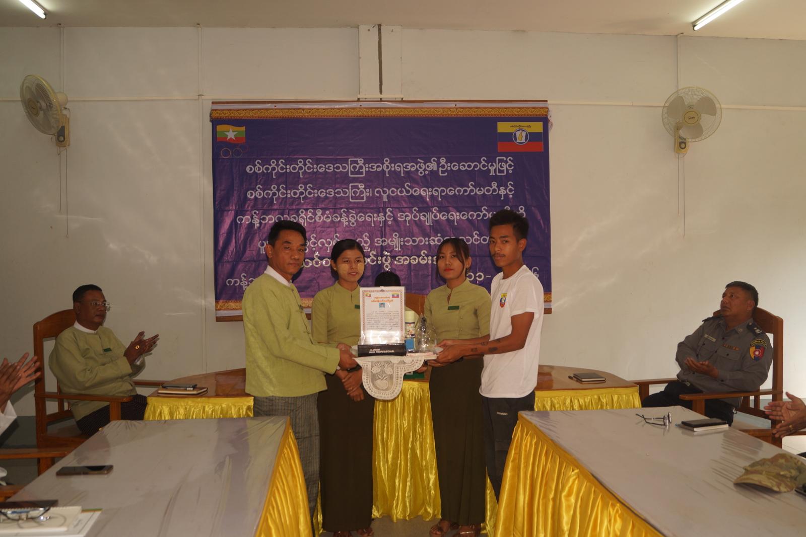 ထို့နောက် သင်တန်းသားနည်းပြဆရာအား ဂုဏ်ပြုမှတ်တမ်းလွှာ၊ သင်တန်းစားရိတ် ထောက်ပံ့ငွေ ကျပ်(၂)သိန်း၊ ဆံပင်ညှပ်ကိရိယာနှင့် ဆက်စပ်ပစ္စည်းများနှင့် သင်တန်းသားများအား သင်တန်းဆင်းလက်မှတ်၊ ဆံပင်ညှပ်ကိရိယာနှင့် ဆက်စပ်ပစ္စည်းများကို ခရိုင်စီမံခန့်ခွဲရေးနှင့်အုပ်ချုပ်ရေးကော်မတီဥက္ကဋ္ဌ ဦးကိုကိုလှိုင်နှင့် တာဝန်ရှိသူများက အသီးသီး ချီးမြှင့်ပေးအပ်သည်။ အဆိုပါသင်တန်းသို့ ခရိုင်စီမံခန့်ခွဲရေးနှင့်အုပ်ချုပ်ရေးကော်မတီဥက္ကဋ္ဌနှင့် အဖွဲ့ဝင်များ၊ မြို့နယ်စီမံခန့်ခွဲရေးနှင့်အုပ်ချုပ်ရေးကော်မတီဥက္ကဋ္ဌ ဦးကျော်ခိုင်ဦးနှင့် အဖွဲ့ဝင်များ၊ သင်တန်းနည်ပြဆရာနှင့် သင်တန်းသား ၃၅ ဦးတို့ တက်ရောက်ခဲ့ကြောင်း သိရသည်။