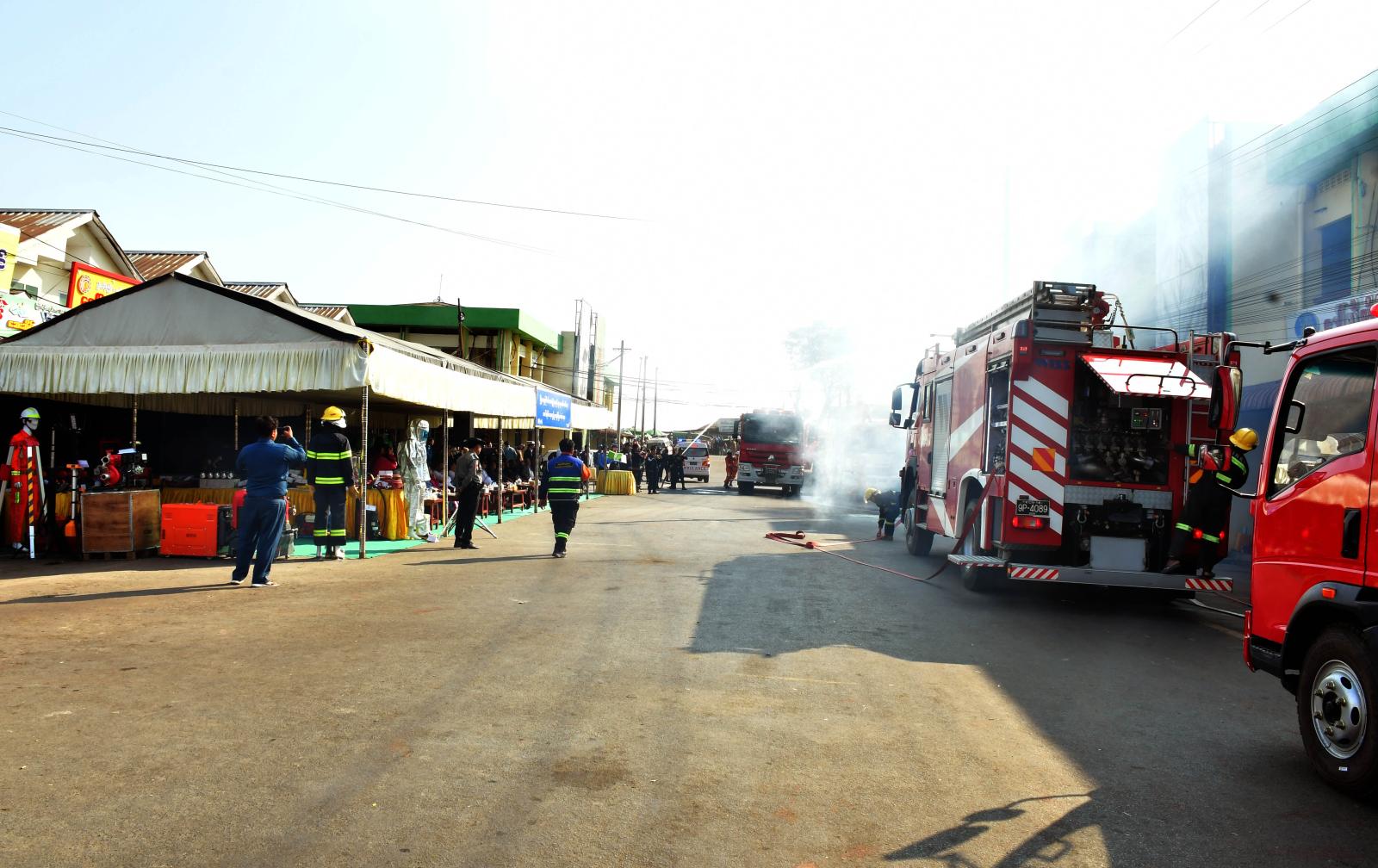 ထို့နောက် မီးသတ်ဦးစီးဌာန တပ်ဖွဲ့ဝင်များက စည်ပင်သာယာရေးအဖွဲ့ဝန်ထမ်းများအား မီးသတ်ဆေးဘူးဖြင့် လက်တွေ့မီးငြှိမ်းသတ်ခြင်း၊ ဆီမီးလောင်မှုအားဖုံးအုပ်ငြှိမ်းသတ်ခြင်းနှင့် ဂက်(စ်) မီးလောင်မှုအား မီးငြှိမ်းသတ်ခြင်းတို့ကို သရုပ်ပြခြင်းနှင့် လက်တွေ့မီးငြှိမ်းသတ်ခြင်းလုပ်ငန်းများ ပူးပေါင်းဆောင်ရွက်ခဲ့ကြပြီး အမှတ် (၁) မီးလောင်မှုအား ခေတ်မီရှာဖွေကယ်ဆယ်ရေး ပစ္စည်းများ အသုံးပြု၍ မီးငြှိမ်းသတ်ကားများဖြင့် မီးငြှိမ်းသတ်ခြင်း၊ ရှာဖွေကယ်ဆယ်ရေးလုပ်ငန်းများ ဆောင်ရွက်ခြင်းတို့ကို လက်တွေ့ဇာတ်တိုက် သရုပ်ပြသမှုကို ကြည့်ရှုအားပေးခဲ့ကြပြီး ပြည်နယ်ဝန်ကြီးချုပ် က မီးသတ်တပ်ဖွဲ့ဝင်များအား ကြိုတင်ကာကွယ်ခြင်း၊ ဖြစ်စဉ်ကို ကြိုတင်ဇာတ်တိုက်လေ့ကျင့်ထား ခြင်းသည် ထိရောက်သော လုပ်ငန်းစဉ်ဖြစ်ပြီး ဝန်ထမ်းများနှင့် ဈေးသူ/ ဈေးသားများ ပူးပေါင်းပါဝင် ရန် လိုအပ်ကြောင်း ဂုဏ်ပြုပြောကြားပြီး မီးသတ်တပ်ဖွဲ့ဝင်များအတွက် ငွေကျပ် ၁၅ သိန်းနှင့် စည်ပင်သာယာရေးအဖွဲ့ဝန်ထမ်းများအတွက် ငွေကျပ် ၁၀ သိန်းကို ထောက်ပံ့ပေးအပ်ခဲ့သည်။
