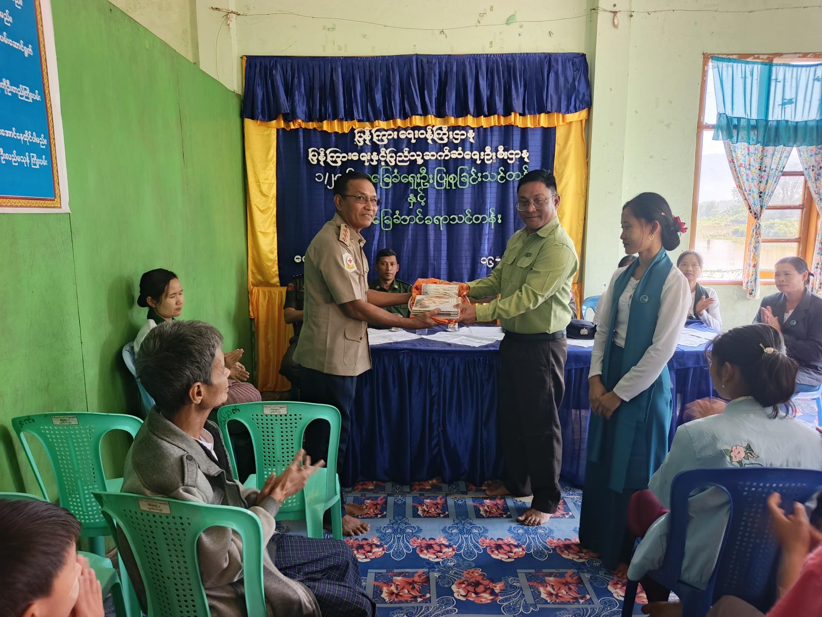 ထို့နောက် အခြေခံပညာအထက်တန်းကျောင်း ကျောင်းအုပ်ဆရာမကြီး ဒေါ်နှင်းနုလှိုင်က ဝမ်းမြောက်စကားပြန်လည်ပြောကြားပြီး တိုင်းဒေသကြီးလွှတ်တော် တိုင်းရင်းသားလူမျိုးများရေးရာကိုယ်စားလှယ် ဦးစောလင်းအောင်က ပေးပို့လှူဒါန်းသည့် ဗလာစာအုပ်နှင့် ဘောပင်များအား မြို့နယ်စီမံခန့်ခွဲရေးနှင့်အုပ်ချုပ်ရေးကော်မတီဥက္ကဋ္ဌမှ မြို့နယ်ကြက်ခြေနီတပ်ဖွဲ့ထံသို့ ပေးအပ်ခဲ့ပြီး အခမ်းအနားအားရုပ်သိမ်းခဲ့ကြောင်း သိရသည်။