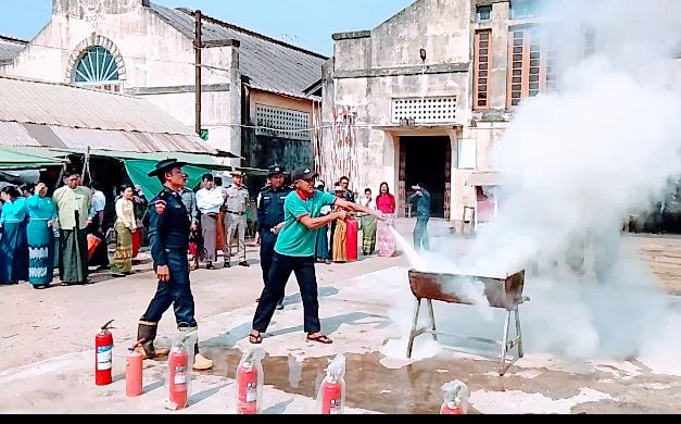 ထိုသရုပ်ပြတွင် မြို့နယ်မီးသတ်ဦးစီးမှူး ဦးစည်သူဝင်းနှင့် ဒုတိယဦးစီးမှူး ဦးကျော်မင်းထွေးတို့က မီးဘေးအန္တရာယ် ကြိုတင်ကာကွယ်ရေးဆိုင်ရာများကို အသိပညာပေးဟောပြောကာ မီးသတ်ဆေးဘူးဖြင့် မီးငြှိမ်းသတ်ခြင်း၊ ရေဆွတ်ထားသည့် စောင်ထည်ဖြင့် အုပ်လွှမ်း၍ မီးငြှိမ်းသတ်ခြင်းများကို သရုပ်ပြသကာ တက်ရောက်လာသူများက ပါဝင်လက်တွေ့ပြုလုပ်ခဲ့ကြသည်။