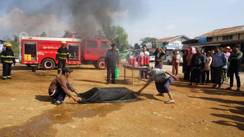 ပအိုဝ်းကိုယ်ပိုင်အုပ်ချုပ်ခွင့်ရဒေသ ဟိုပုံးမြို့နယ်၌ မြို့မဈေးအတွင်း လက်တွေ့မီးငြှိမ်းသတ်နည်း လက်တွေ့သရုပ်ပြ