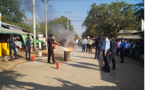 မော်လိုက်မြို့၌ မြို့မဈေးအတွင်း မီးဘေးအန္တရာယ်အသိပညာပေးခြင်းနှင့် မီးငြှိမ်းသတ်နည်း သရုပ်ပြ ဇာတ်တိုက်လေ့ကျင့်