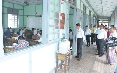 မန္တလေးတိုင်းဒေသကြီးအစိုးရအဖွဲ့ဝန်ကြီးချုပ် ဦးမျိုးအောင် ကျောင်းသား၊ ကျောင်းသူများ နှစ်ဆုံးစာမေးပွဲဖြေဆိုနေမှုများကို လိုက်လံကြည့်ရှု