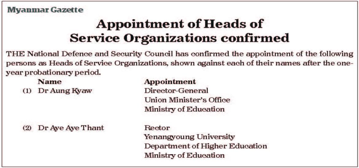 9th Myanmar-India Joint Trade Committee meeting held | Jan 22, 2026 Myanmar’s lawyers continue to respond in Gambia-Myanmar case | Jan 22, 2026 Myanmar MSME Cluster Footwear Manufacturers Federation (Central) | Jan 22, 2026 Appointment of Heads of Service Organizations confirmed | Jan 22, 2026 Myanmar Eyes Russia, EU Markets for Raw Bamboo Shoot Exports | Jan 22, 2026 Myanmar hosts 10th ASEAN Seaport Interdiction Task Force meeting | Jan 21, 2026 Tatmadaw restores Thabeikkyin-Mogok route; Travel resumes | Jan 21, 2026 Republic of the Union of Myanmar Union Election Commission Announcement 23/2026 | Jan 21, 2026 Republic of the Union of Myanmar Union Election Commission Announcement 22/2026 | Jan 21, 2026 Latest News | Jan 22, 2026 9th Myanmar-India Joint Trade Committee meeting held | Jan 22, 2026 Myanmar’s lawyers continue to respond in Gambia-Myanmar case | Jan 22, 2026 Myanmar MSME Cluster Footwear Manufacturers Federation (Central) | Jan 22, 2026 Appointment of Heads of Service Organizations confirmed | Jan 22, 2026 Myanmar Eyes Russia, EU Markets for Raw Bamboo Shoot Exports | Jan 21, 2026 Myanmar hosts 10th ASEAN Seaport Interdiction Task Force meeting Most Popular 182 EPS Myanmar workers deployed on 22 Apr Apr 23, 2025 21 cold storage facilities gear up to export freshwater fish to Saudi Arabia Apr 23, 2025 Myanmar-China Friendship Association funds religious site restorations in Mandalay & Sagaing Apr 23, 2025 Deputy PM MoTC Union Minister inspects Pyinmana Station, Cybersecurity Department Apr 23, 2025 Yangon’s high-rise apartment sales decline Apr 23, 2025 13 minor tremors shake Myanmar-Thailand border on 22 Apr Apr 23, 2025 CHAIRMAN OF THE STATE ADMINISTRATION COUNCIL'S SPEECH CONSTITUTION OF THE REPUBLIC OF THE UNION OF MYANMAR(2008) FIVE-POINT ROAD MAP OF THE STATE ADMINISTRATION COUNCIL FOUR OBJECTIVES OF THE NATIONAL DEFENCE AND SECURITY COUNCIL