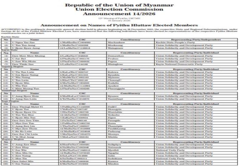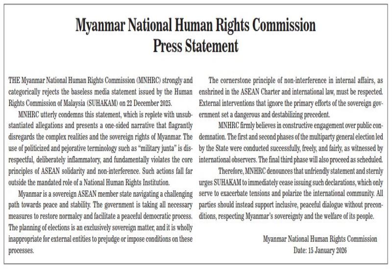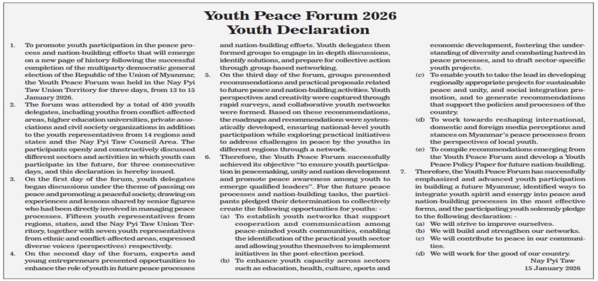Shwedagon to host 18th annual Htamane Festival & Contest | Jan 16, 2026 Myanmar National Human Rights Commission Press Statement | Jan 16, 2026 Republic of the Union of Myanmar Union Election Commission Announcement 14/2026 | Jan 16, 2026 Oral hearing continues for Gambia-Myanmar case | Jan 16, 2026 Youth Peace Forum 2026 wraps up on third day | Jan 16, 2026 Youth Peace Forum 2026 Youth Declaration | Jan 16, 2026 Naga residents urged to safeguard stability and peace | Jan 16, 2026 74th Anniversary of Kayah State Day marked in Loikaw | Jan 16, 2026 Press briefing on seizures of drugs, equipment and production sites | Jan 15, 2026 THE information was released on 11 January regarding the combi Latest News | Jan 16, 2026 Shwedagon to host 18th annual Htamane Festival & Contest | Jan 16, 2026 Myanmar National Human Rights Commission Press Statement | Jan 16, 2026 Republic of the Union of Myanmar Union Election Commission Announcement 14/2026 | Jan 16, 2026 Youth Peace Forum 2026 wraps up on third day | Jan 16, 2026 Oral hearing continues for Gambia-Myanmar case | Jan 16, 2026 Youth Peace Forum 2026 Youth Declaration Most Popular 182 EPS Myanmar workers deployed on 22 Apr Apr 23, 2025 21 cold storage facilities gear up to export freshwater fish to Saudi Arabia Apr 23, 2025 Myanmar-China Friendship Association funds religious site restorations in Mandalay & Sagaing Apr 23, 2025 Deputy PM MoTC Union Minister inspects Pyinmana Station, Cybersecurity Department Apr 23, 2025 Yangon’s high-rise apartment sales decline Apr 23, 2025 13 minor tremors shake Myanmar-Thailand border on 22 Apr Apr 23, 2025 CHAIRMAN OF THE STATE ADMINISTRATION COUNCIL'S SPEECH CONSTITUTION OF THE REPUBLIC OF THE UNION OF MYANMAR(2008) FIVE-POINT ROAD MAP OF THE STATE ADMINISTRATION COUNCIL FOUR OBJECTIVES OF THE NATIONAL DEFENCE AND SECURITY COUNCIL
