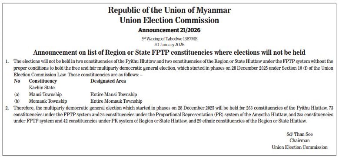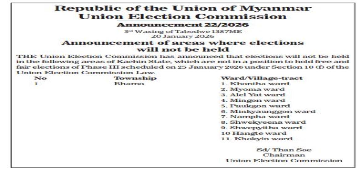 Myanmar hosts 10th ASEAN Seaport Interdiction Task Force meeting | Jan 21, 2026 Tatmadaw restores Thabeikkyin-Mogok route; Travel resumes | Jan 21, 2026 Republic of the Union of Myanmar Union Election Commission Announcement 23/2026 | Jan 21, 2026 Republic of the Union of Myanmar Union Election Commission Announcement 22/2026 | Jan 21, 2026 Union Info Minister honours MRTV freshers | Jan 21, 2026 Myanmar, India to discuss trade promotion at 9th Joint Trade Committee Meeting | Jan 21, 2026 Myanmar, Russia pledge to deepen cooperation in agri sector | Jan 21, 2026 Myanmar’s lawyers continue to respond in Gambia-Myanmar case | Jan 21, 2026 Republic of the Union of Myanmar Union Election Commission Announcement 21/2026 | Jan 21, 2026 Latest News | Jan 21, 2026 Myanmar hosts 10th ASEAN Seaport Interdiction Task Force meeting | Jan 21, 2026 Tatmadaw restores Thabeikkyin-Mogok route; Travel resumes | Jan 21, 2026 Republic of the Union of Myanmar Union Election Commission Announcement 23/2026 | Jan 21, 2026 Republic of the Union of Myanmar Union Election Commission Announcement 22/2026 | Jan 21, 2026 Union Info Minister honours MRTV freshers | Jan 21, 2026 Myanmar, India to discuss trade promotion at 9th Joint Trade Committee Meeting Most Popular Deputy PM MoTC Union Minister inspects Pyinmana Station, Cybersecurity Department Apr 23, 2025 Yangon’s high-rise apartment sales decline Apr 23, 2025 13 minor tremors shake Myanmar-Thailand border on 22 Apr Apr 23, 2025 Myanmar extradites 20 undocumented entrants Apr 23, 2025 Statement on Temporary Ceasefire Apr 23, 2025 Nay Pyi Taw Development Committee invites tender for 5,000 tonnes of coal Apr 23, 2025 CHAIRMAN OF THE STATE ADMINISTRATION COUNCIL'S SPEECH CONSTITUTION OF THE REPUBLIC OF THE UNION OF MYANMAR(2008) FIVE-POINT ROAD MAP OF THE STATE ADMINISTRATION COUNCIL FOUR OBJECTIVES OF THE NATIONAL DEFENCE AND SECURITY COUNCIL