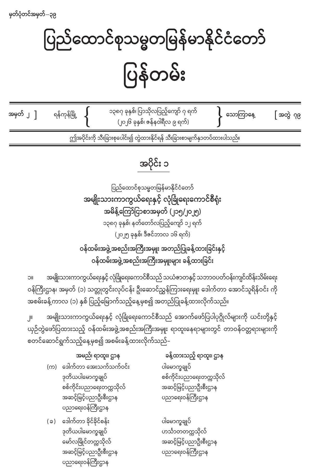 အပိုင်း (၁) တွင် အမျိုးသားကာကွယ်ရေးနှင့် လုံခြုံရေးကောင်စီရုံး အမိန့်ကြော်ငြာစာ၊ ပုဂ္ဂလိကပိုင်ပြုလုပ်ရေးကော်မရှင် အမိန့်ကြော်ငြာစာ၊ အမျိုးသားသဘာဝဘေးအန္တရာယ် ဆိုင်ရာ စီမံခန့်ခွဲမှုကော်မတီ အမိန့်ကြော်ငြာစာ၊ စက်မှုလုပ်ငန်းနှင့် စက်မှုဇုန်ဖွံ့ဖြိုး တိုးတက်ရေးဗဟိုကော်မတီ အမိန့်ကြော်ငြာစာ၊ နိုင်ငံအဆင့် ပင်လယ်ကမ်းရိုးတန်း သယံဇာတစီမံအုပ်ချုပ်လုပ်ကိုင်မှုဗဟိုကော်မတီ အမိန့်ကြော်ငြာစာ၊ မြေလွတ်၊ မြေလပ်နှင့် မြေရိုင်းများစီမံခန့်ခွဲရေးဗဟိုကော်မတီ အမိန့်ကြော်ငြာစာ၊ ခရီးသွားလုပ်ငန်းကော်မတီ အမိန့် ကြော်ငြာစာ၊ ကုန်သွယ်မှုနှင့် ကုန်စည်စီးဆင်းမှုများ မှန်ကန်မြန်ဆန်စေရေး ဗဟိုကော်မတီ အမိန့်ကြော်ငြာစာ၊ အမျိုးသားမြေအသုံးချမှုကောင်စီ အမိန့်ကြော်ငြာစာ၊ မြန်မာနိုင်ငံ အစား အသောက်နှင့် ဆေးဝါးအာဏာပိုင်အဖွဲ့ အမိန့်ကြော်ငြာစာ၊ အမျိုးသားစီမံကိန်းဝန်ကြီးဌာန အမိန့်ကြော်ငြာစာ၊ ပို့ဆောင်ရေးနှင့် ဆက်သွယ်ရေးဝန်ကြီးဌာန (ဝန်ကြီးရုံး) အမိန့် ကြော်ငြာစာ၊ ဘဏ္ဍာရေးနှင့် အခွန်ဝန်ကြီးဌာန အမိန့်ကြော်ငြာစာ၊ ပြည်ထဲရေးဝန်ကြီးဌာန (ဝန်ကြီးရုံး) အမိန့်ကြော်ငြာစာ၊ နယ်စပ်ရေးရာဝန်ကြီးဌာန (ဝန်ကြီးရုံး) အမိန့်ကြော်ငြာစာ၊ တိုင်းရင်းသားလူမျိုးများရေးရာဝန်ကြီးဌာန (ပြည်ထောင်စုဝန်ကြီးရုံး) အမိန့်ကြော်ငြာစာ၊ ပြန်ကြားရေးဝန်ကြီးဌာန အမိန့်ကြော်ငြာစာ၊ သာသနာရေးနှင့် ယဉ်ကျေးမှုဝန်ကြီးဌာန အမိန့် ကြော်ငြာစာ၊ စိုက်ပျိုးရေး၊ မွေးမြူရေးနှင့် ဆည်မြောင်းဝန်ကြီးဌာန (ပြည်ထောင်စုဝန်ကြီးရုံး) အမိန့်ကြော်ငြာစာ၊ သယံဇာတနှင့် သဘာဝပတ်ဝန်းကျင်ထိန်းသိမ်းရေးဝန်ကြီးဌာန (ပြည် ထောင်စုဝန်ကြီးရုံး) အမိန့်ကြော်ငြာစာ၊ လျှပ်စစ်စွမ်းအားဝန်ကြီးဌာန အမိန့်ကြော်ငြာစာ၊ စက်မှုဝန်ကြီးဌာန အမိန့်ကြော်ငြာစာ၊ စီးပွားရေးနှင့် ကူးသန်းရောင်းဝယ်ရေးဝန်ကြီးဌာန (ပြည်ထောင်စုဝန်ကြီးရုံး) အမိန့်ကြော်ငြာစာ၊ ပညာရေးဝန်ကြီးဌာန (ဝန်ကြီးရုံး) အမိန့် ကြော်ငြာစာ၊ သိပ္ပံနှင့် နည်းပညာဝန်ကြီးဌာန (ဝန်ကြီးရုံး) အမိန့်ကြော်ငြာစာ၊ အားကစားနှင့် လူငယ်ရေးရာဝန်ကြီးဌာန အမိန့်ကြော်ငြာစာ၊ ဟိုတယ်နှင့် ခရီးသွားလာရေးဝန်ကြီးဌာန (ပြည်ထောင်စုဝန်ကြီးရုံး) အမိန့်ကြော်ငြာစာ၊ ဆောက်လုပ်ရေးဝန်ကြီးဌာန (ပြည်ထောင်စု ဝန်ကြီးရုံး) အမိန့်ကြော်ငြာစာ၊ လူမှုဝန်ထမ်း၊ ကယ်ဆယ်ရေးနှင့် ပြန်လည်နေရာချထားရေး ဝန်ကြီးဌာန (ဝန်ကြီးရုံး) အမိန့်ကြော်ငြာစာ၊ ပြည်ထောင်စုစာရင်းစစ်ချုပ်ရုံး အမိန့် ကြော်ငြာစာ၊ ပြည်ထောင်စုရာထူးဝန်အဖွဲ့ အမိန့်ကြော်ငြာစာ၊ နေပြည်တော်စည်ပင် သာယာရေးကော်မတီ အမိန့်ကြော်ငြာစာတို့ ပါဝင်ပါသည်။