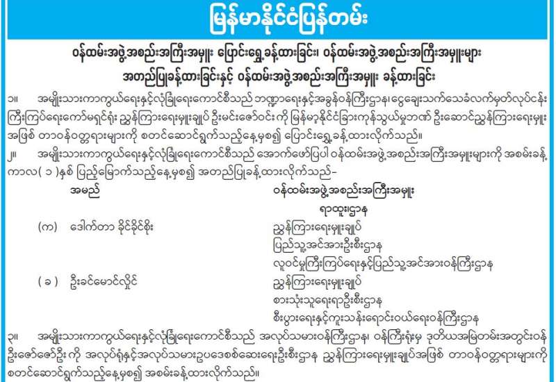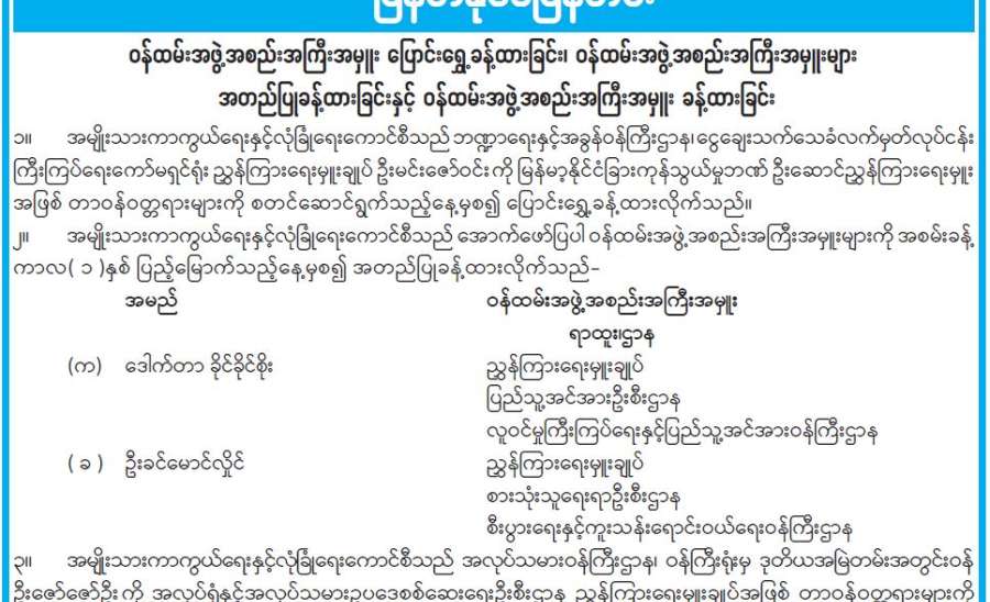 ဝန်ထမ်းအဖွဲ့အစည်းအကြီးအမှူး ပြောင်းရွှေ့ခန့်ထားခြင်း၊ ဝန်ထမ်းအဖွဲ့အစည်းအကြီးအမှူးများ အတည်ပြုခန့်ထားခြင်းနှင့် ဝန်ထမ်းအဖွဲ့အစည်းအကြီးအမှူး ခန့်ထားခြင်း