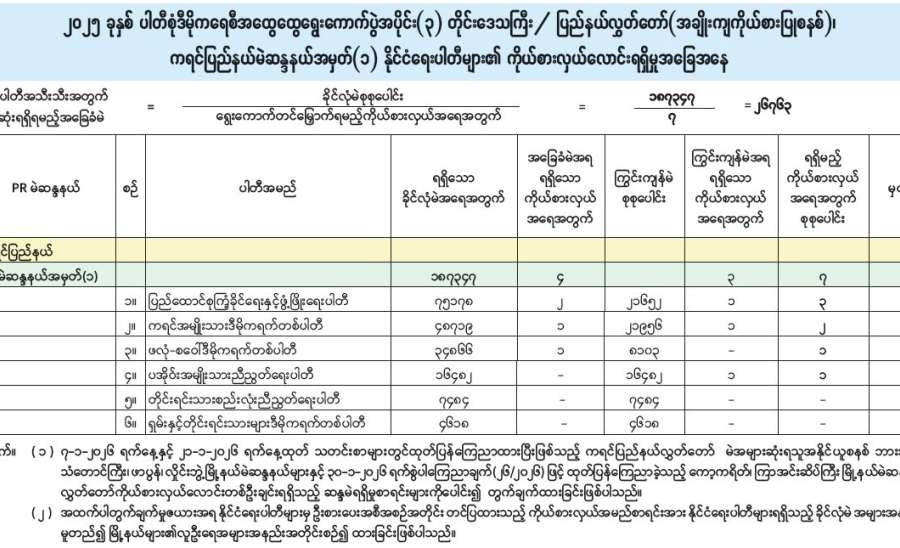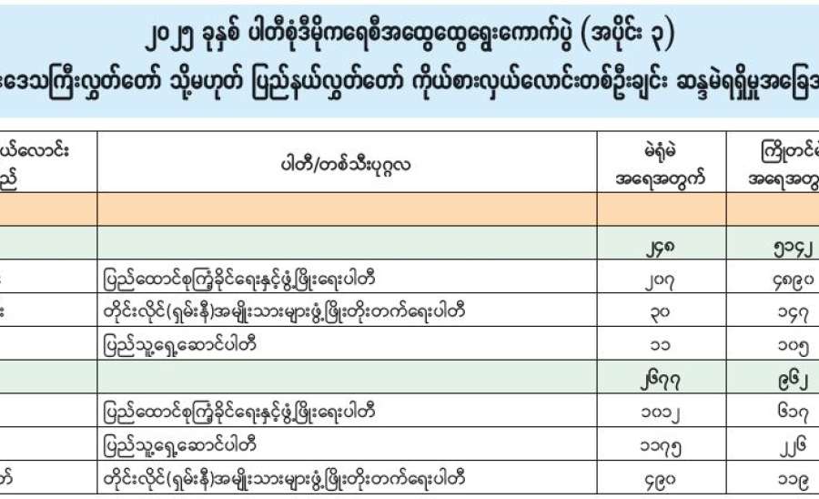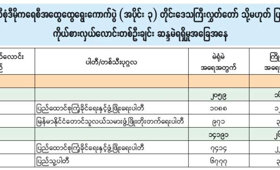အမျိုးသားလွှတ်တော် (အချိုးကျကိုယ်စားပြုစနစ်)၊ ဧရာဝတီတိုင်းဒေသကြီးမဲဆန္ဒနယ်အမှတ် (၂) နိုင်ငံရေးပါတီများ၏ ကိုယ်စားလှယ်လောင်းရရှိမှုအခြေအနေ