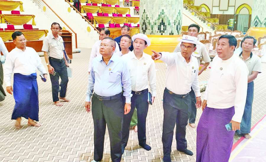 ဆဋ္ဌသင်္ဂါယနာတင်အောင်ပွဲ နှစ်(၇၀)ပြည့် အထိမ်းအမှတ် မဟာမင်္ဂလာအခမ်းအနား ကျင်းပမည့် သမိုင်းဝင်အဆောက်အအုံများနှင့်လမ်းများ ပြုပြင်မွမ်းမံထိန်းသိမ်းရေးလုပ်ငန်း ဆပ်ကော်မတီဥက္ကဋ္ဌ ဆောက်လုပ်ရေးဝန်ကြီးဌာန ဒုတိယဝန်ကြီး ဦးမျိုးမြင့်သည် ရန်ကုန်မြို့တော်ဝန်၊ လျှပ်စစ်၊ စွမ်းအင်၊ စက်မှုနှင့် လမ်းပန်းဆက်သွယ်ရေးဝန်ကြီးနှင့်အတူ လုပ်ငန်းဆောင်ရွက်နေမှုအခြေအနေကို ကြည့်ရှုစစ်ဆေးသည်။