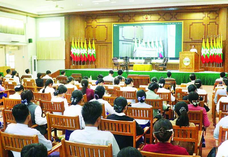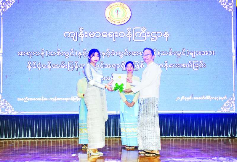 ကျန်းမာရေးဝန်ကြီးဌာန ဆရာဝန် (သစ်လွင်) နှင့် သွားနှင့်ခံတွင်းဆရာဝန် (သစ်လွင်) များအား နိုင်ငံ့ဝန်ထမ်းပြန်တမ်းဝင်အရာရှိအဖြစ် တာဝန်ပေးအပ်ခြင်းအခမ်းအနားကို ယနေ့နံနက် ၉ နာရီတွင် ကျန်းမာရေးဝန်ကြီးဌာန အစည်းအဝေးခန်းမ၌ ကျင်းပသည်။