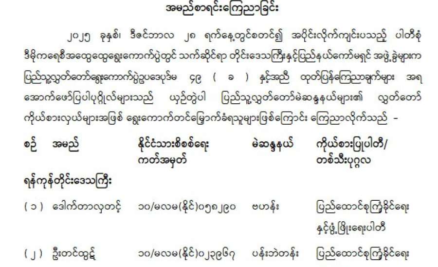 ၁။ နိုင်ငံရေးပါတီများအနေဖြင့် ဖွဲ့စည်းပုံအခြေခံဥပဒေ ပုဒ်မ ၄၀၇ (ဂ)၊ ပုဒ်မ ၄၀၈ နှင့် နိုင်ငံရေးပါတီများမှတ်ပုံတင်ခြင်းဥပဒေပုဒ်မ ၆(စ)ပါ ပြဋ္ဌာန်းချက်များအရ “ နိုင်ငံခြားတိုင်းပြည် တစ်ခုခု၏အစိုးရ သို့မဟုတ် ဘာသာရေးအဖွဲ့အစည်း သို့မဟုတ် အခြားအဖွဲ့အစည်းတစ်ခုခု သို့မဟုတ် ပုဂ္ဂိုလ်တစ်ဦးဦးထံမှ ငွေကြေး၊ ပစ္စည်း၊ အခြားအထောက်အပံ့ကို တိုက်ရိုက်ဖြစ်စေ၊ သွယ်ဝိုက်၍ဖြစ်စေ ရယူသုံးစွဲခြင်း သို့မဟုတ် ယင်းတို့၏ဩဇာခံယူခြင်း မပြုရေး " ကို စောင့်ထိန်း လိုက်နာရန်တာဝန်ရှိပြီး လိုက်နာရန်ပျက်ကွက်ပါက နိုင်ငံရေးပါတီအဖြစ်မှတ်ပုံတင်ထားခြင်းကို ပယ်ဖျက်ရမည်ဖြစ်ကြောင်း ပြည်ထောင်စုရွေးကောက်ပွဲကော်မရှင်၏ ၁၁-၈-၂၀၂၂ ရက်စွဲပါ စာအမှတ်၊ ၅/နငရ-ကြီးကြပ်(၄၉)/ကမရ ဖြင့် နိုင်ငံရေးပါတီအားလုံးသို့ အကြောင်းကြားခဲ့ပြီး ဖြစ်ပါသည်။
