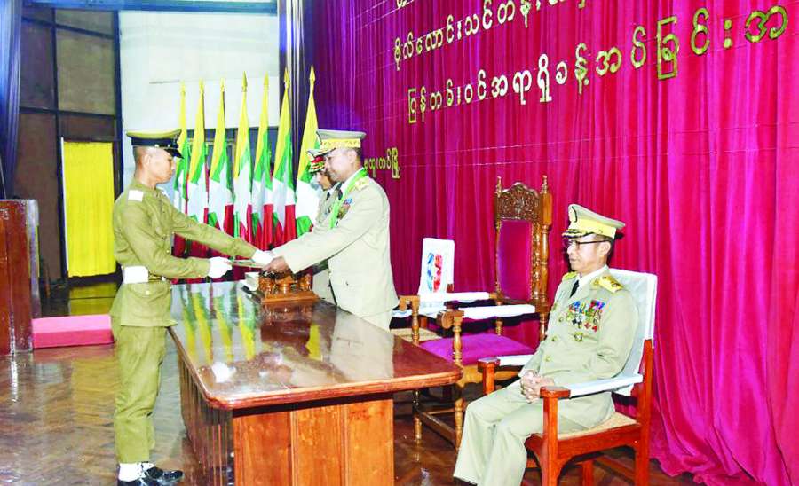 တပ်မတော် (ကြည်း) ဗိုလ်သင်တန်းကျောင်း (ဗထူး) ဗိုလ်လောင်းသင်တန်းအမှတ်စဉ် (၁၂၉) သီဟတပ်ခွဲ ပြန်တမ်းဝင်အရာရှိခန့်အပ်ခြင်းအခမ်းအနားကို ယနေ့နံနက်ပိုင်းတွင် တပ်မတော် (ကြည်း) ဗိုလ်သင်တန်းကျောင်း (ဗထူး)၊ စစ်ရာထူးခန့်ထားရေးခန်းမဆောင်၌ ကျင်းပရာ ကာကွယ်ရေးဦးစီးချုပ်ရုံး (ကြည်း) မှ စစ်ရာထူးခန့်ချုပ် ဒုတိယဗိုလ်ချုပ်ကြီး ထိန်ဝင်း၊ ဒုတိယတပ်မတော်လေ့ကျင့်ရေးအရာရှိချုပ် ဗိုလ်ချုပ်ဝင်းဗိုလ်၊ ကျောင်းအုပ်ကြီး ဗိုလ်မှူးချုပ် မင်းသီဟ၊ ကျောင်းဆင်းဗိုလ်လောင်းများ၊ ၎င်းတို့၏မိဘဆွေမျိုးများနှင့် နည်းပြများ တက်ရောက်ကြသည်။
