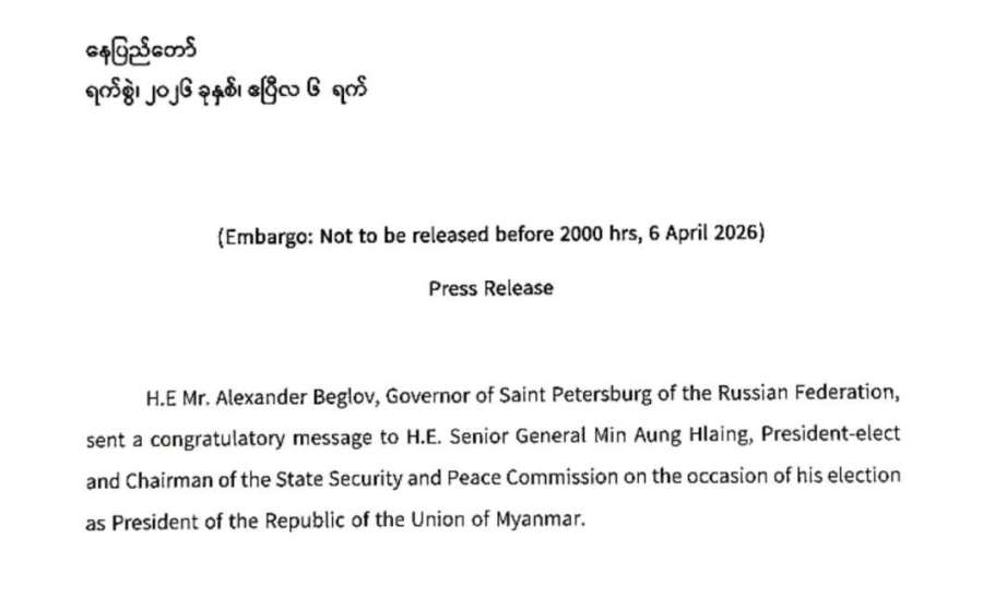 ပြည်ထောင်စုသမ္မတမြန်မာနိုင်ငံတော် ယာယီသမ္မတ နိုင်ငံတော်လုံခြုံရေးနှင့် အေးချမ်းသာယာရေးကော်မရှင်ဥက္ကဋ္ဌ ဗိုလ်ချုပ်မှူးကြီး မင်းအောင်လှိုင်အား နိုင်ငံတော်သမ္မတအဖြစ် ရွေးကောက်တင်မြှောက်ခြင်းခံရသည့်အတွက် ရုရှားဖက်ဒရေးရှင်းနိုင်ငံ ဘူရားတီးရားပြည်နယ်အကြီးအကဲနှင့် အစိုးရအဖွဲ့ဥက္ကဋ္ဌ မစ္စတာ အလက်စီဆမ်ဘူယဲဗစ် စီဂျယ်နော့ဗ်ထံမှ ဝမ်းမြောက်ကြောင်း သဝဏ်လွှာပေးပို့