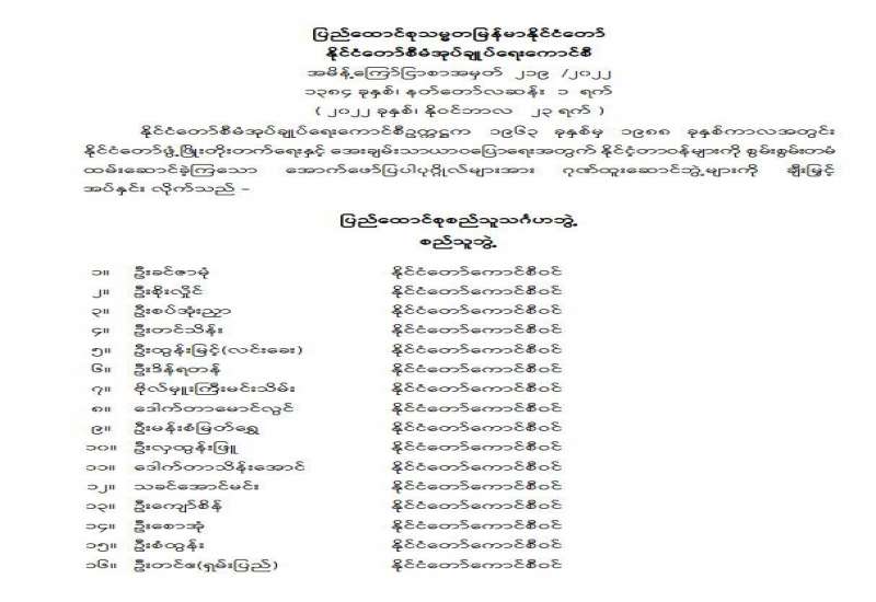 ၁။ ၂၀၂၂ ခုနှစ်အတွင်း ပြည်ထောင်စုသမ္မတမြန်မာနိုင်ငံတော်၊ နိုင်ငံတော်စီမံအုပ်ချုပ်ရေး ကောင်စီ အမိန့်ကြော်ငြာစာအမှတ်(၂/၂၀၂၂)၊ (၅၄/၂၀၂၂)၊ (၆၃/၂၀၂၂)၊ (၂၁၁/၂၀၂၂)၊ (၂၁၂/၂၀၂၂)၊ (၂၁၃/၂၀၂၂)၊ (၂၁၄/၂၀၂၂)၊ (၂၁၅/၂၀၂၂)၊ (၂၁၈/၂၀၂၂)၊ (၂၁၉/၂၀၂၂)၊ (၂၂၀/၂၀၂၂)၊ (၂၂၁/၂၀၂၂)တို့ဖြင့် အဂ္ဂမဟာသီရိသုဓမ္မဘွဲ့၊ သတိုးသီရိသုဓမ္မဘွဲ့၊ အဂ္ဂမဟာ သရေစည်သူဘွဲ့၊ သတိုးမဟာသရေစည်သူဘွဲ့၊ မဟာသရေစည်သူဘွဲ့၊ သရေစည်သူဘွဲ့၊ စည်သူဘွဲ့၊ သူရဘွဲ့၊ သီရိပျံချီဘွဲ့၊ ဇေယျကျော်ထင်ဘွဲ့၊ ဝဏ္ဏကျော်ထင်ဘွဲ့၊ အလင်္ကာ ကျော်စွာဘွဲ့၊ သိပ္ပကျော်စွာဘွဲ့ စသည့် စွမ်းဆောင်မှုဆိုင်ရာ ဂုဏ်ထူးဆောင်ဘွဲ့များကို ချီးမြှင့်ခဲ့ပြီးဖြစ်ပါသည်။