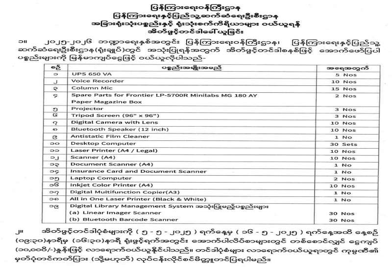 ပြန်ကြားရေးနှင့်ပြည်သူ့ဆက်ဆံရေးဦးစီးဌာန၊ အခြားရုံးသုံးပစ္စည်းနှင့်ရုံးသုံးစက်ကိရိယာများဝယ်ယူရန် အိတ်ဖွင့်တင်ဒါခေါ်ယူခြင်း