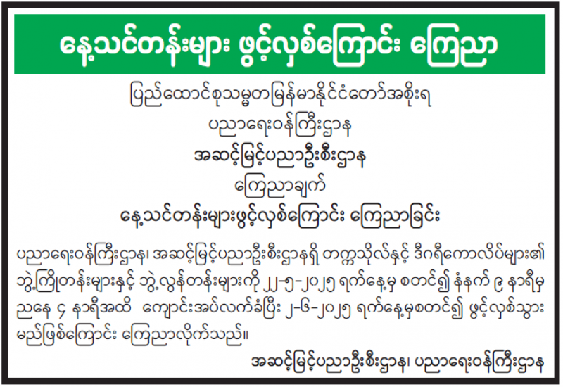 ပြန်ကြားရေးဝန်ကြီးဌာန၊ ပြန်ကြားရေးနှင့်ပြည်သူ့ဆက်ဆံရေးဦးစီးဌာန၏ ၂၀၂၅-၂၀၂၆ ဘဏ္ဍာရေးနှစ်တွင် ပြည်ထောင်စုငွေလုံးငွေရင်းအသုံးစရိတ်ဖြင့် မူပိုင်ခွင့်နှင့်မှတ်ပုံတင်ဌာနခွဲ (ရန်ကုန်)၊ ပင်မရုံးအဆောက်အအုံ အရှေ့ဘက်ခြမ်း အမိုး Slab အား (၅) နှစ်ခံ ရေတားဆေးသုတ်ခြင်း (၁၇၆၀ စတုရန်းပေ)၊ သွပ်လဲလှယ်ခြင်းနှင့် ဒိုင်းပြုပြင်ခြင်း လုပ်ငန်းဆောင်ရွက်ရန်အတွက် ပြန်ကြားရေးဝန်ကြီးဌာန၊ ဝန်ကြီးရုံး၏ သဘောတူညီချက်အရ Father Country Co.,Ltd က ငွေကျပ် ၂၆,၅၀၀,၀၀၀/- ဖြင့် တင်ဒါအောင်မြင်ကြောင်း ကြေညာအပ်ပါသည်။