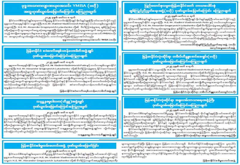နိုင်ငံတော်စီမံအုပ်ချုပ်ရေးကောင်စီဥက္ကဋ္ဌ နိုင်ငံတော်ဝန်ကြီးချုပ် ဗိုလ်ချုပ်မှူးကြီး မင်းအောင်လှိုင် ဦးဆောင်သော အဆင့်မြင့်ကိုယ်စားလှယ်အဖွဲ့သည် ရုရှားဖက်ဒရေးရှင်းနိုင်ငံ သမ္မတကြီး H.E. Mr. Vladimir Vladimirovich Putin နှင့် ဘယ်လာရုစ်သမ္မတနိုင်ငံသမ္မတကြီး H.E. Mr. Alexander Gregoryevich Lukashenko တို့၏ ဖိတ်ကြားခဲ့မှုအရ နိုင်ငံတော်အဆင့် ချစ်ကြည်ရေးခရီးစဉ်များအတွင်း နိုင်ငံတော်နှင့် ပြည်သူလူထု၏ အကျိုးစီးပွားကို အောင်မြင်မှုများစွာရရှိအောင် ဖော်ဆောင်နိုင်ခဲ့ခြင်းအတွက် မြန်မာ-အိန္ဒိယ အပြည်ပြည်ဆိုင်ရာ စီးပွားရေးလုပ်ငန်းရှင်များအသင်းချုပ်က အထူးပင်ဂုဏ်ယူဝမ်းမြောက် မိပါကြောင်း သဘောထားထုတ်ပြန်အပ်ပါသည်။