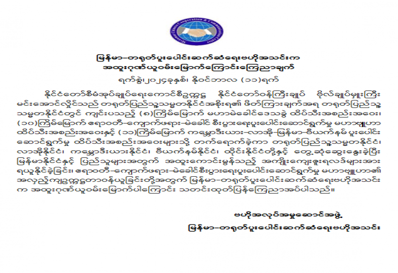 တရုတ်ပြည်သူ့သမ္မတနိုင်ငံတွင် ကျင်းပပြုလုပ်ခဲ့သည့် (၈) ကြိမ်မြောက် မဟာမဲခေါင်ဒေသခွဲ ထိပ်သီးအစည်းအဝေး၊ (၁၀) ကြိမ်မြောက် ဧရာဝတီ-ကျောက်ဖရား-မဲခေါင် စီးပွားရေးပူးပေါင်းဆောင်ရွက်မှု မဟာဗျူဟာထိပ်သီးအစည်းအဝေးနှင့် (၁၁) ကြိမ်မြောက် ကမ္ဘောဒီးယား-လာအို-မြန်မာ-ဗီယက်နမ် ပူးပေါင်းဆောင်ရွက်မှုထိပ်သီးအစည်းအဝေးများသို့ အောင်မြင်စွာ တက်ရောက်နိုင်ခဲ့သည့်အပြင် အာဆီယံနိုင်ငံများမှ ဝန်ကြီးချုပ်များ၊ တာဝန်ရှိသူများနှင့် တွေ့ဆုံဆွေးနွေးခဲ့ပြီး မြန်မာ-တရုတ် နှစ်နိုင်ငံပြည်သူများအတွက် အထူးကောင်းမွန်သည့် အကျိုးကျေးဇူးရလဒ်များအား ရယူနိုင်ခဲ့သည့်အပြင် အိမ်နီးချင်းနိုင်ငံများအတွက်ပါ အခွင့်အလမ်းကောင်းများ ဖော်ဆောင်နိုင်ခဲ့မှုအတွက် နိုင်ငံတော်စီမံအုပ်ချုပ်ရေးကောင်စီဥက္ကဋ္ဌ နိုင်ငံတော်ဝန်ကြီးချုပ် ဗိုလ်ချုပ်မှူးကြီး မင်းအောင်လှိုင်အား မိမိတို့ မြန်မာ-အိန္ဒိယ ချစ်ကြည်ရေးနှင့် ဖွံ့ဖြိုးတိုးတက်ရေးအသင်းက အထူးပင်ဂုဏ်ယူဝမ်းမြောက်ပါကြောင်း ထုတ်ပြန်အပ်ပါသည်။