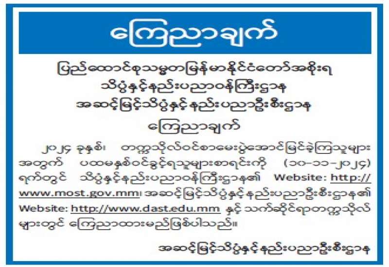 ၂၀၂၄ ခုနှစ်၊ တက္ကသိုလ်ဝင်စာမေးပွဲအောင်မြင်ခဲ့ကြသူများ အတွက် ပထမနှစ်ဝင်ခွင့်ရသူများစာရင်းကို (၁၀-၁၁-၂၀၂၄) ရက်တွင် သိပ္ပံနှင့်နည်းပညာဝန်ကြီးဌာန၏ Website: http://www.most.gov.mm၊ အဆင့်မြင့်သိပ္ပံနှင့်နည်းပညာဦးစီးဌာန၏ Website: http://www.dast.edu.mm နှင့် သက်ဆိုင်ရာတက္ကသိုလ်များတွင် ကြေညာထားမည်ဖြစ်ပါသည်