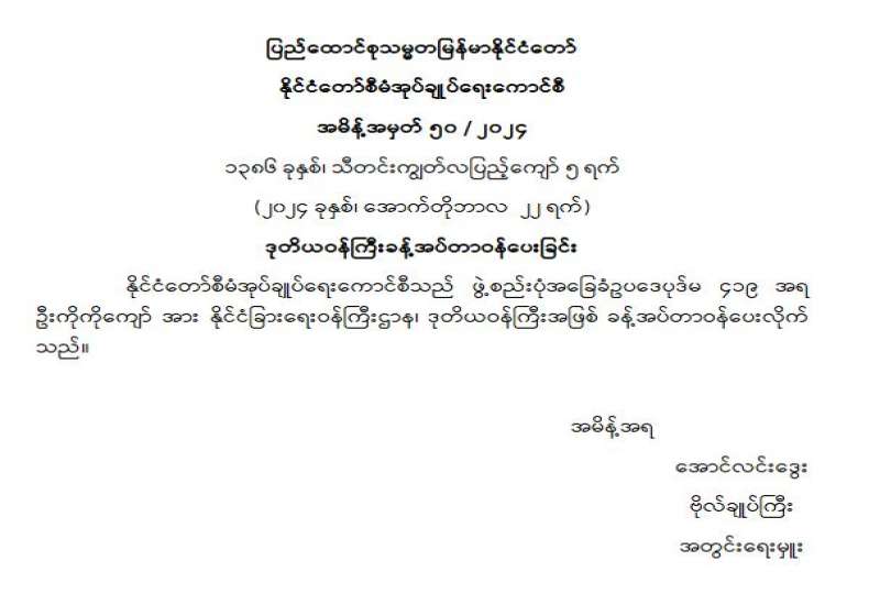 နိုင်ငံတော်စီမံအုပ်ချုပ်ရေးကောင်စီသည် စွမ်းအင်ဝန်ကြီးဌာန၊ ရေနံထွက်ပစ္စည်းကြီးကြပ်စစ်ဆေးရေးဦးစီးဌာနမှ ဒုတိယညွှန်ကြားရေးမှူးချုပ် ဦးထက်သျှန်ဖြိုးကို ပြည်ထောင်စုဝန်ကြီးရုံး ညွှန်ကြားရေးမှူးချုပ်အဖြစ် တာဝန်ဝတ္တရားများကို စတင်ဆောင်ရွက်သည့်နေ့မှစ၍ အစမ်းခန့်ထားလိုက်သည်။