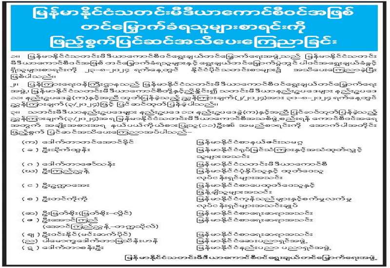 မြန်မာနိုင်ငံသတင်းမီဒီယာကောင်စီဝင်အဖြစ် တင်မြှောက်ခံရသူများစာရင်းကို ဖြည့်စွက်ပြင်ဆင်အသိပေးကြေညာခြင်း