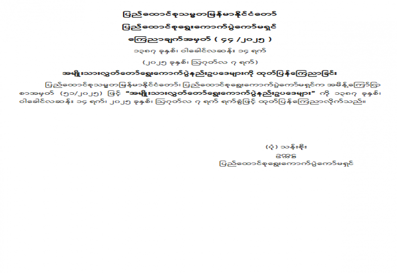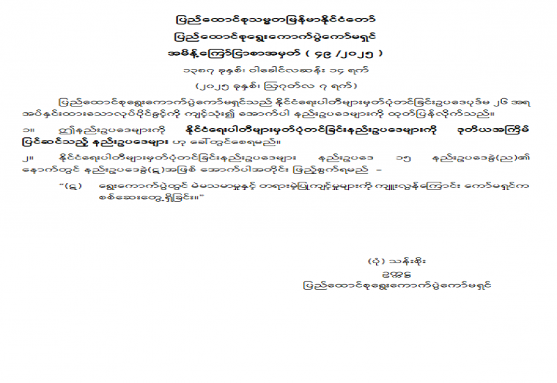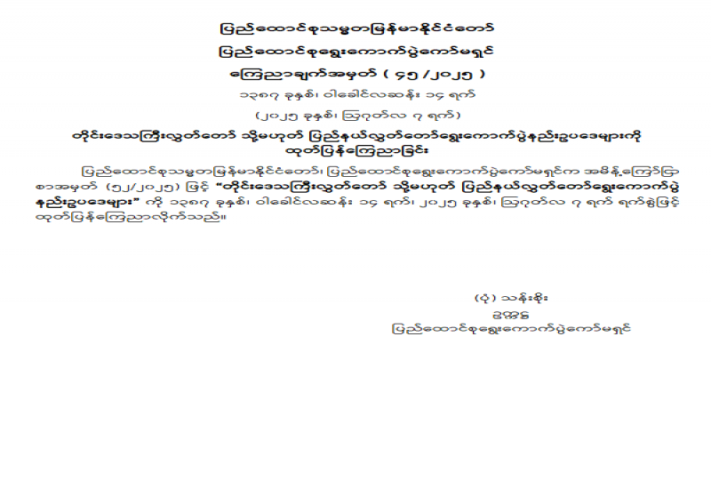 တိုင်းဒေသကြီးလွှတ်တော် သို့မဟုတ် ပြည်နယ်လွှတ်တော်ရွေးကောက်ပွဲနည်းဥပဒေများကို ထုတ်ပြန်ကြေညာခြင်း